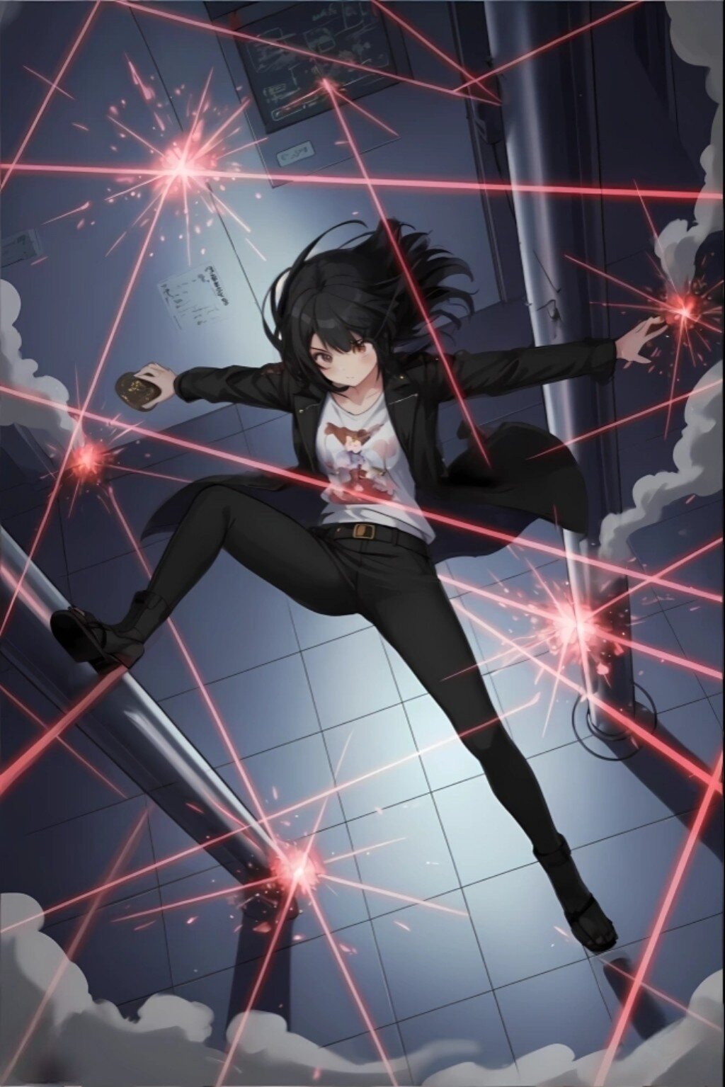 anime style, a secret agent woman in a black suit, black pants, white t-shirt, navigating a laser grid in a high-tech vault, intricate laser beams, sparks, smoke, dynamic pose, action shot, high angle, detailed background, sharp focus, dramatic lighting, (black hair:1.2), (brown eyes:1.1), determined expression, holding a small device,