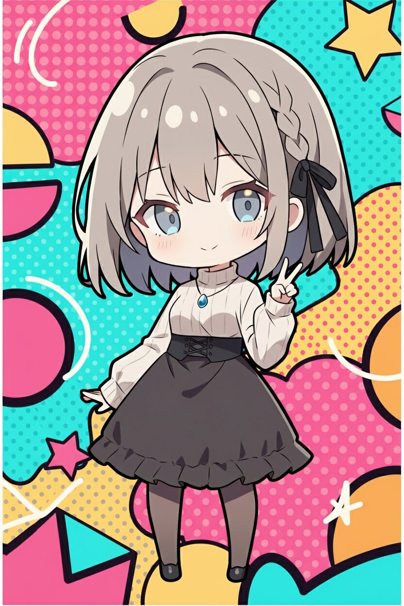 {{volumetric lighting, cinematic lighting}}, {{{gleaming skin}}}, 1girl, rating:general, amazing quality, great quality, aesthetic, absurdres, Anime style, Digital illustration, 1.3::anime screenshot::, scute anime-style,0.8::flat color::,1.2::beautiful eyes::,looking at viewer, simple background, pop background, girl, elegant young woman, short silver hair with side braid and black ribbon, blue-gray eyes, calm smile, white turtleneck sweater, black high-waist skirt with corset belt, blue gem necklace, neat and modest outfit, soft lighting, gentle atmosphere, modern fantasy style, chibi only, full body, peace sign,