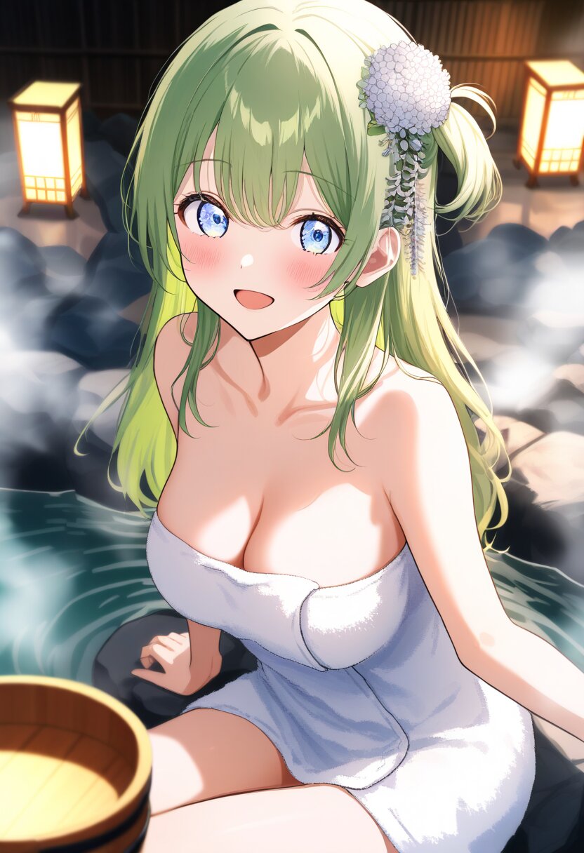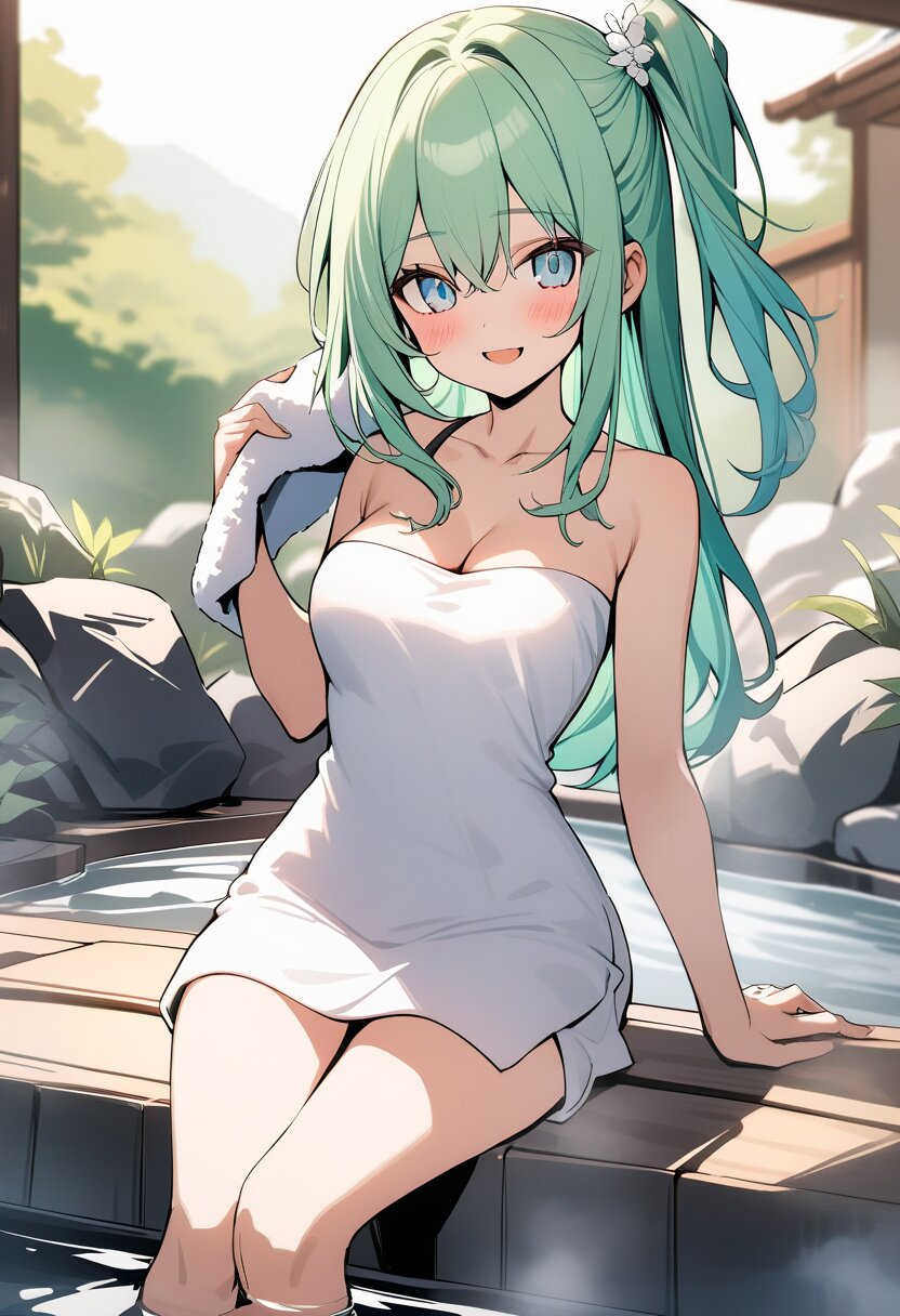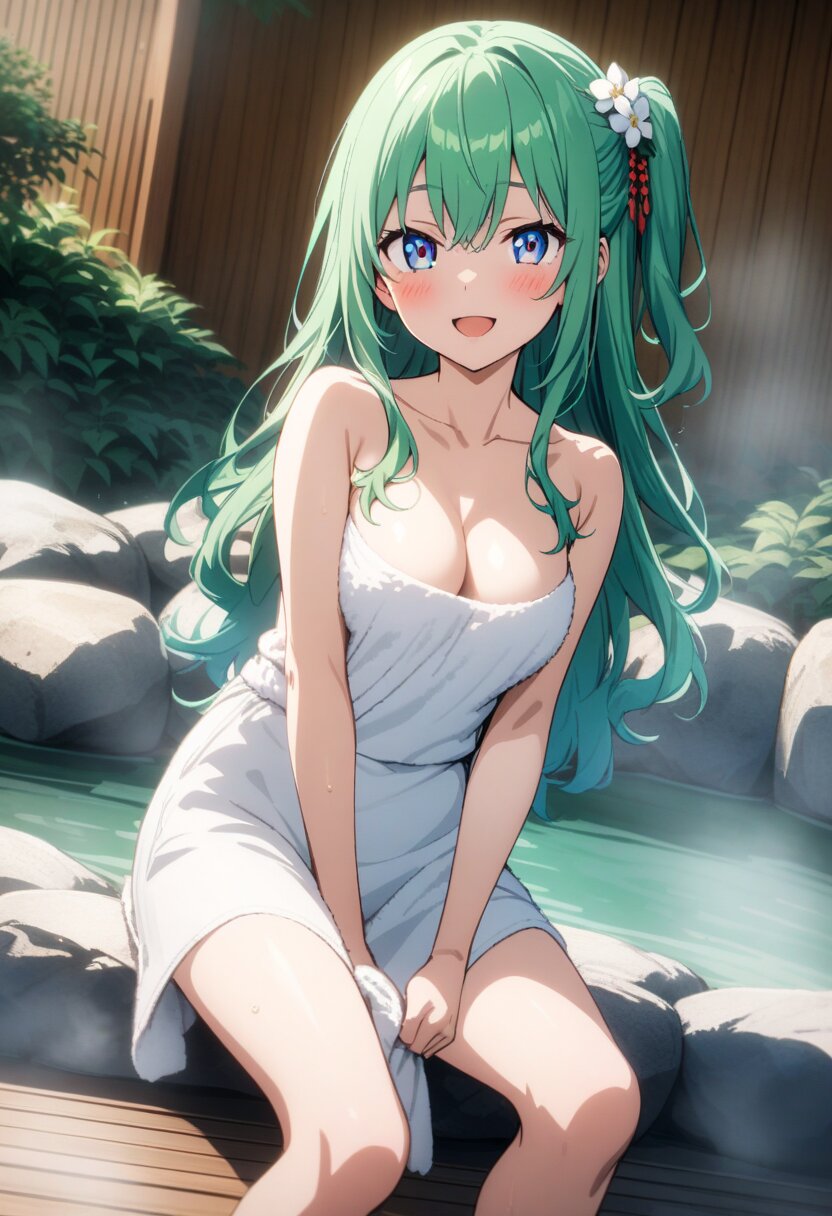 best quality,absurdres,8k,ultra detailed,very aesthetic, an anime image of a girl wearing a white flower sitting next to a hot spring, 1girl, long hair, one side up, onsen, outdoor, steam, (green hair:1.2), hair ornament, flower, solo, (medium breasts:1.3), towel, looking at viewer, smile, open mouth, cleavage, blue eyes, beautiful detailed eyes, (eye highlights:1.2), (hair between eyes:0.7), 16yo, girl, perfectly round breasts, blush, collarbone, bangs, holding towel,