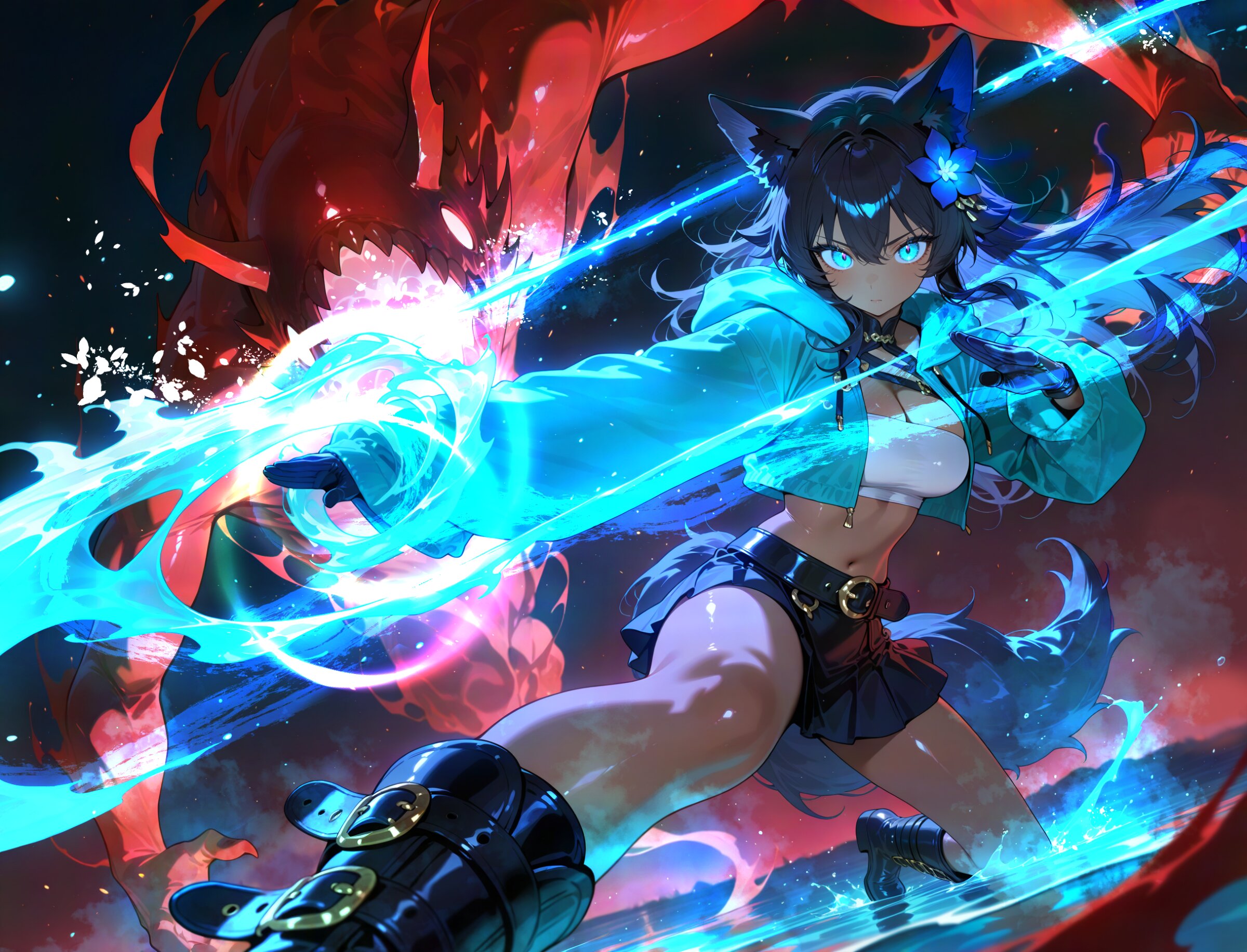foreshortening, (close to viewer:1.2), knees out of frame from behind facing away, looking at monster 1girl, black wolf ears, dark skin, young beautiful girl, large breasts, tall, wolf tail, (aristocratic features), (Black Hair:1.2) (disheveled long hair over ears:1.3) messy hair ornament flower, (perfect turquoise eyes:1.3) long eyelashes,, wearing turquoise hood down and white tube top leather gloves, lether miniskirt, belt boots, turquoise hoodie, water magic, , kung fu attack, kung fu pose, kung fu action, (swirling energy,energy magic,energy:1.2), water magic, partially underwater shot, partially submerged, great clear water, reflection, , medieval fantasy world, battle (huge scarlet silhouette of ghost, faceless monster:1.3), (scarlet monster:1.2), duel, fighting, danmaku, incoming attack, super fine concept art, hard surface, 8K, unreal engine, masterpiece, best quality, amazing quality, very aesthetic, absurdres you can add scenery, (volumetric lighting), To make the background more distinctive. professional art lots of details, , overexposure, shiny-glistening, (watercolor style:0.5), (pastel color style:0.0) 4ur4_illu,shiny, glowing, glowing particles, glowing light particles, light particles, , <lora:noline (1):-0.5> <lora:sdxl2-flat2-512b:0.0> <lora:facelightup_xl_v10:0.5> <lora:V2_yakumo_alchemy:0.5> <lora:Aura_illu:0.1>