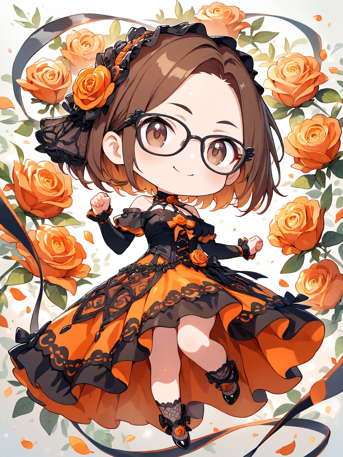 Brown hair, brown eyes, forehead, glasses, short hair. The orange gothic dress, richly gathered, is accented with a black corset and a black lace ribbon belt. The off-shoulder dress features black lace elegantly adorning the neckline, while black rose lace delicately trims the orange satin dress. Asymmetrical front and back, the elegantly flowing hem layers multiple lace overlays, generously adorned with orange artificial roses black heel and orange rose accessory, solo, fullbody, chibi, smile, dynamic action