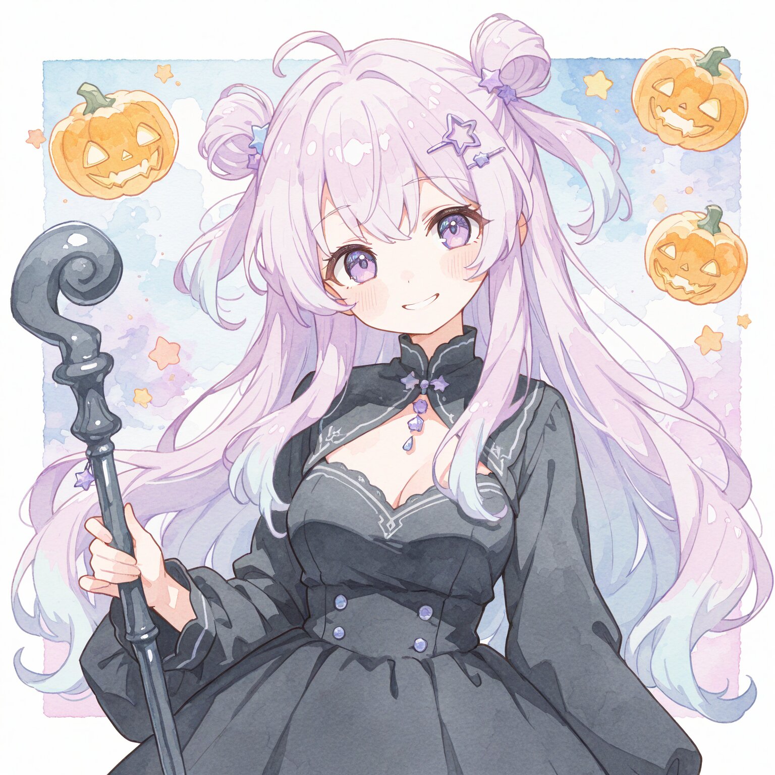 A beautiful witch in a flowing black dress, holding a broomstick, surrounded by glowing pumpkins, watercolor style, pastel colors, whimsical background., Pastel color palette, (Upper body: 0.9), soft cute girl with soft lavender hair and light blue inner highlights, long hair with two side buns and loose curls, one stray hair, large, bright purple eyes, a gentle smile, a faint glow, anime-style with emphasized contours, flat pastel-toned shading.single ahoge, medium breasts,star-shaped hairpin,, masterpiece、best quality、amazing quality, solo, kawaii, cute, (soft pastel color palette:1.5), (pale colors:1.3), watercolor texture, matte finish, subtle shading, minimal contrast,, (Tilt head: 1.2), (a big smile:1.2)
