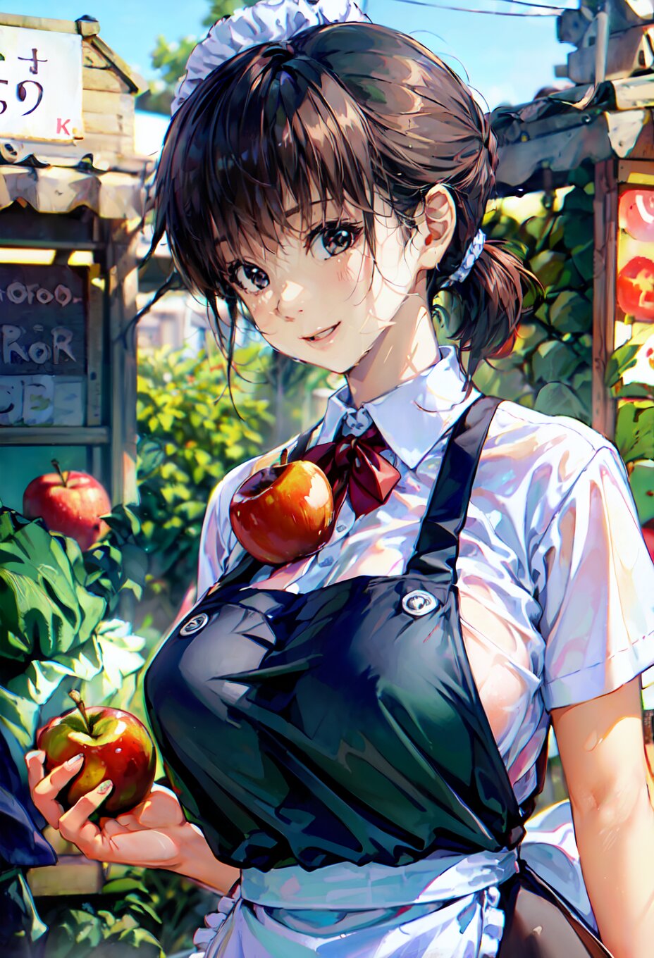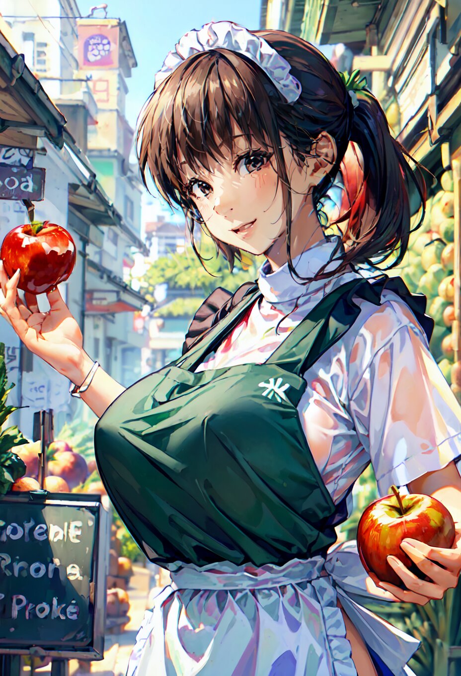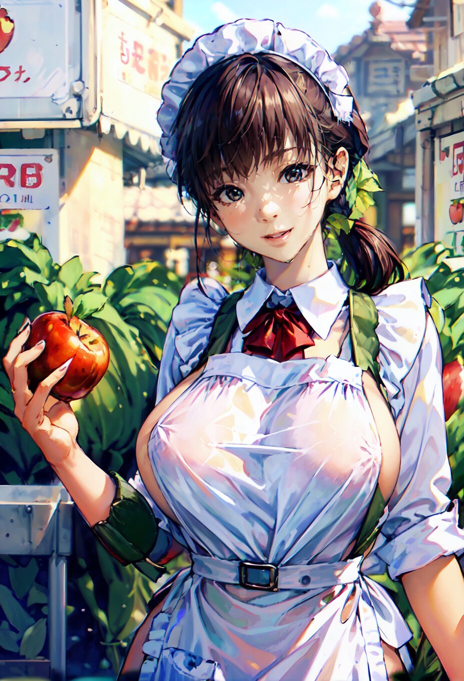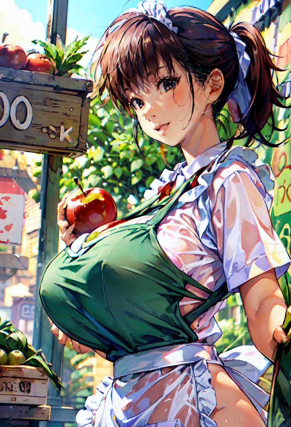 (8k, best quality, masterpiece:1.4), (realistic, photo-realistic:1.6), HDR, (incredibly absurdres:1.2), ultra-detailed, (from front: 1.8), 1girl, solo, 18 years old, (gigantic breasts: 1.4), (white shirt, sexy apron: 1.6), ponytail, (upper body: 1.6), perfect body, highly detailed, shiny skin, shiny hair, looking away, (holding an apple, standing & working in the Greengrocer: 1.6), <lora:akih_v01:1>
