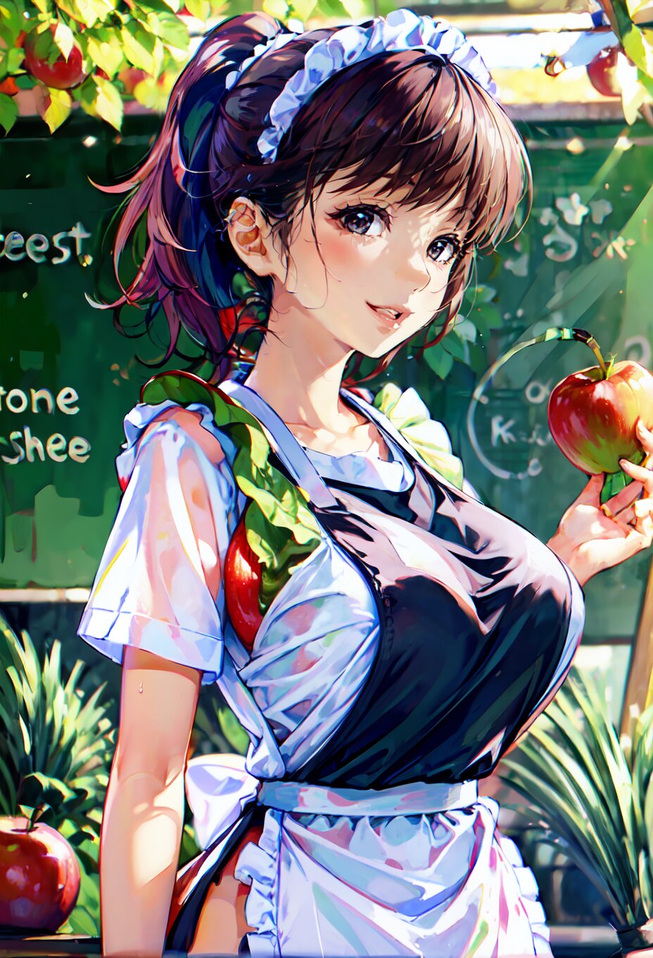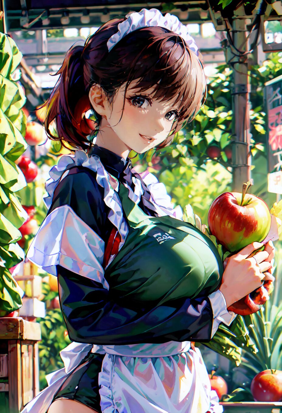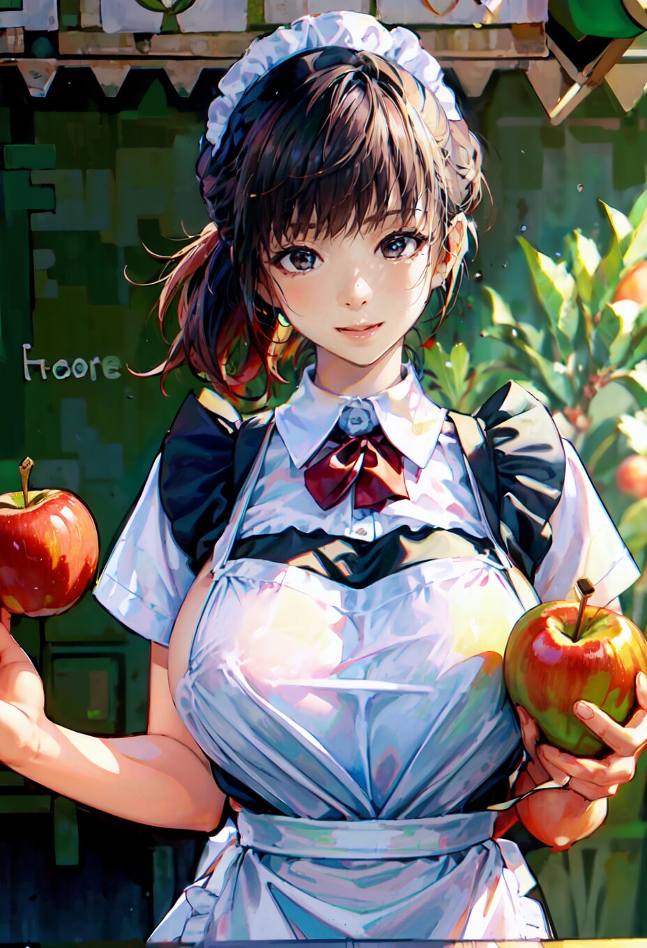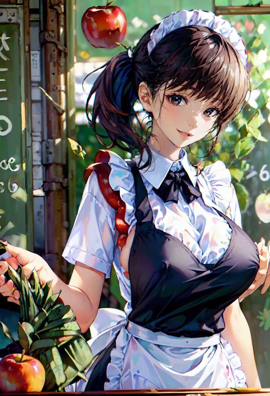 (8k, best quality, masterpiece:1.4), (realistic, photo-realistic:1.6), HDR, (incredibly absurdres:1.2), ultra-detailed, (from front: 1.8), 1girl, solo, 18 years old, (gigantic breasts: 1.4), (white shirt, sexy apron: 1.6), ponytail, (upper body: 1.6), perfect body, highly detailed, shiny skin, shiny hair, looking away, (holding an apple, standing & working in the Greengrocer: 1.6), <lora:akih_v01:1>