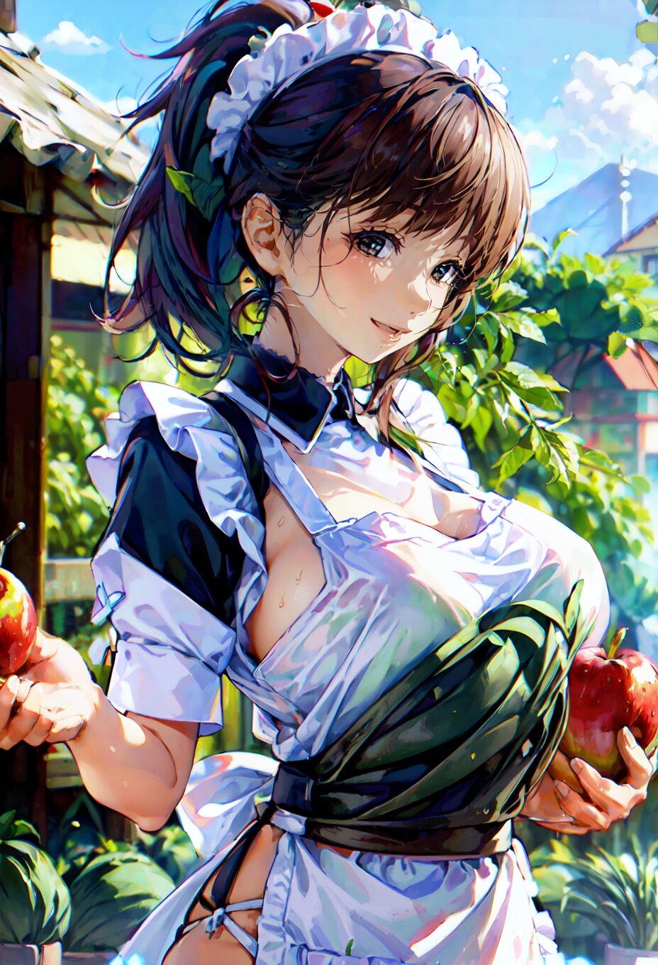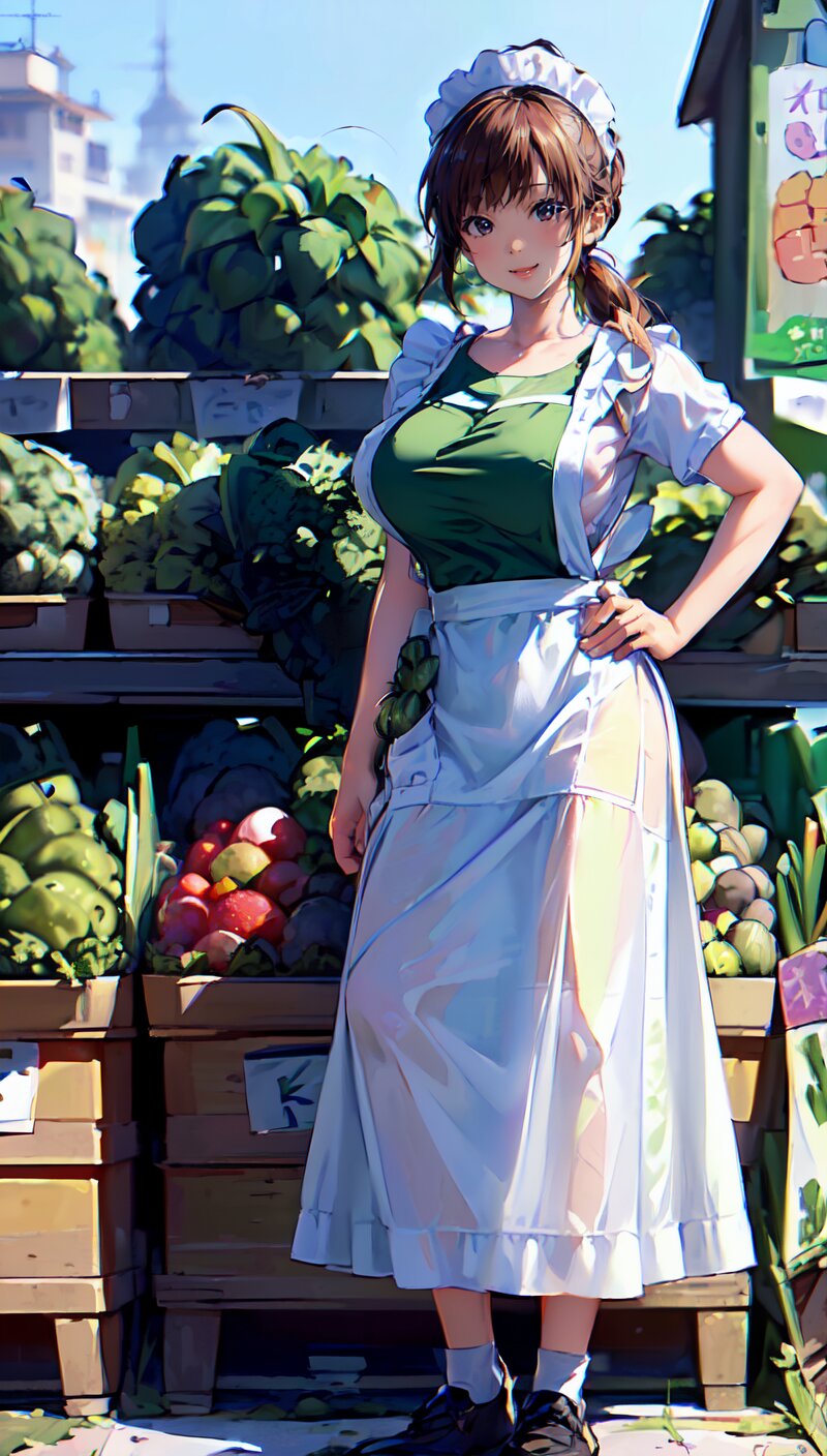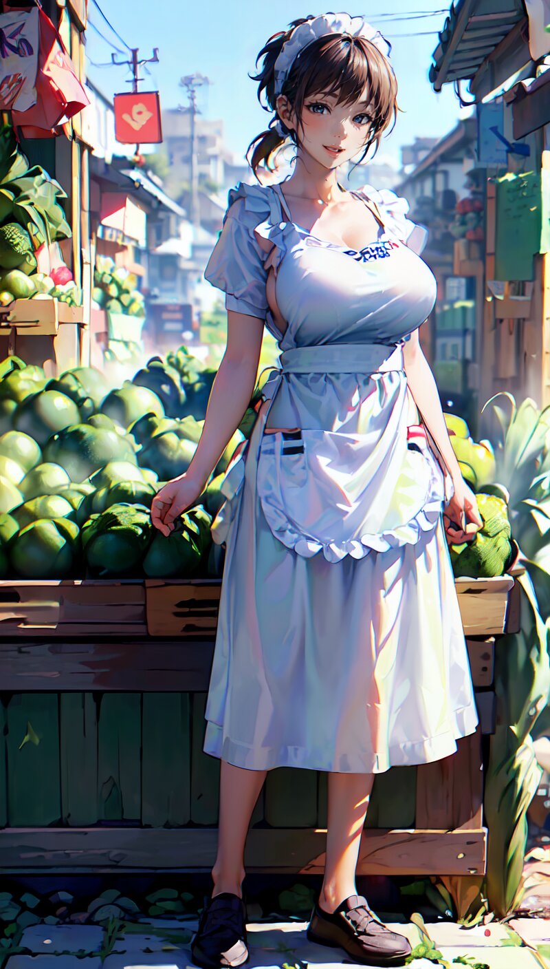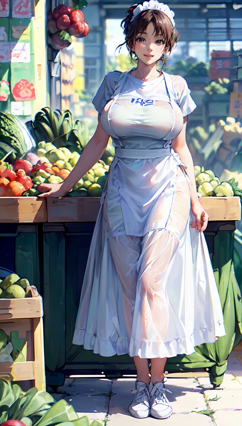 (8k, best quality, masterpiece:1.4), (realistic, photo-realistic:1.6), HDR, (incredibly absurdres:1.2), ultra-detailed, (from front: 1.8), 1girl, solo, 18 years old, (gigantic breasts: 1.4), (white shirt, sexy apron: 1.6), ponytail, (upper body: 1.6), perfect body, highly detailed, shiny skin, shiny hair, looking away, (holding an apple, standing & working in the Greengrocer: 1.6), <lora:akih_v01:1>