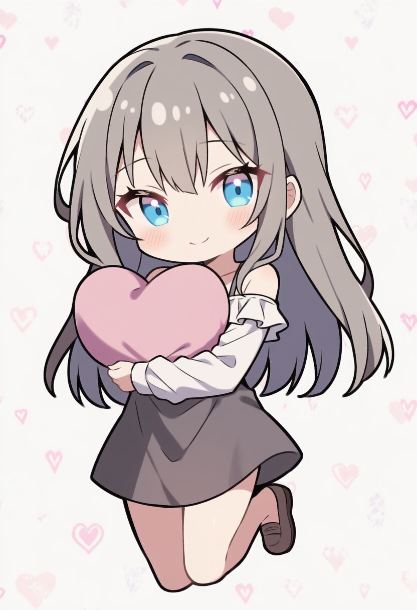 {{volumetric lighting, cinematic lighting}}, {{{gleaming skin}}}, 1girl, rating:general, amazing quality, great quality, aesthetic, absurdres, Anime style, Digital illustration, 1.3::anime screenshot::, scute anime-style,0.8::flat color::,1.2::beautiful eyes::,looking at viewer, simple background, heart background, girl,chibi only,17years old, white hair, long hair, blue eyes,cowboy shot,hair between eyes,straight hair, grey hair, sidelocks, blush, off-shoulder shirt, smile, Embrace the heart-shaped cushion, loafers,