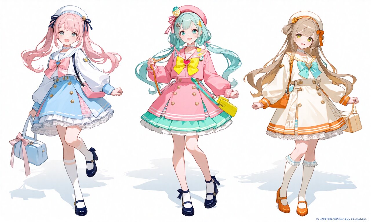 (pastel marine sailor lolita outfit:1.4), sailor-collar blouse with short puff sleeves, large pastel pink ribbon bow at the chest, decorative gold buttons, pleated skirt with double stripe hem in pastel blue and white, layered lace petticoat visible beneath, frilled sleeves and ribbon accents, navy ribbon trim, delicate lace details around collar and cuffs, soft pastel blue and white color palette with light pink accents, beret or mini sailor hat with anchor emblem and ribbon tails, lace choker with pearl charm, bracelet with small anchor motif, cute earrings, small shoulder bag shaped like a seashell, knee-high socks with frilled lace trim, glossy white mary jane shoes with ribbon bows, refined, cheerful, and airy impression, (detailed fabric texture:1.2)