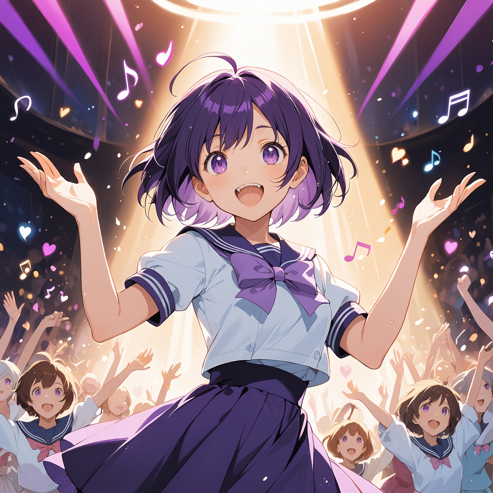 In a lively concert hall under warm spotlight illumination, an adorable young anime character girl with sleek black short bob hair, a quirky ahoge antenna hair tuft bouncing energetically, piercing amethyst purple eyes filled with joy and passion, belting out a heartfelt song. Her expression is ecstatic with slightly parted lips forming an 'o' shape, subtle sweat drops for intensity, small fangs peeking out for cuteness. Dressed in a cute sailor-style uniform with purple accents, bow tie, and skirt fluttering from her enthusiastic movements. She's holding a retro microphone in her right hand, left hand gesturing expressively as if reaching out to the audience. Surrounding her are glowing holographic musical notes and hearts, with a blurred crowd cheering in the distant background. Ultra-detailed digital art, Studio Ghibli-inspired whimsy mixed with modern anime aesthetics, high resolution, dynamic composition, soft bokeh effects, vivid yet harmonious color palette.