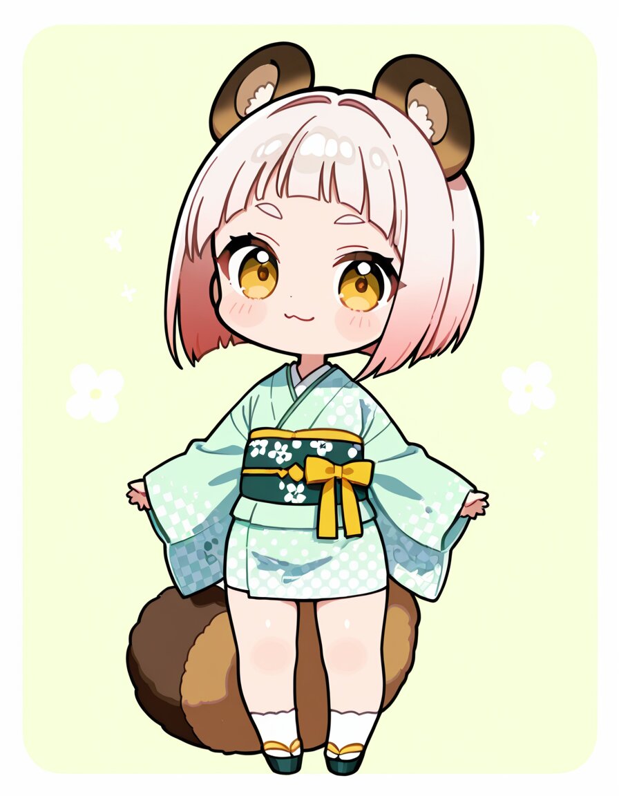 (chibi:1.4),kawaii,flat chest,(light red short bob hair:1.4),wearing a modern style mint green pastel kimono with subtle asanoha geometric patterns,deep navy obi with thin silver line tied simply,fluffy tanuki ears and large fluffy tail spreading naturally behind her