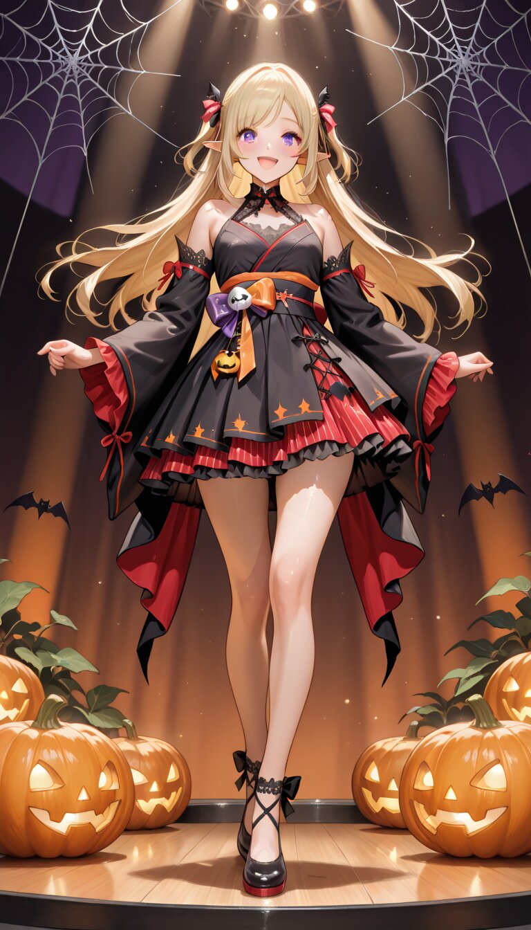 (masterpiece, best quality, highly detailed, ultra detailed, anime style, semi-realistic, official illustration, soft lighting, full body view, idol outfit, stage style, solo, standing pose), cheerful expression, she is wearing a Halloween-themed stage outfit. The costume is based on a modern idol style, featuring subtle traditional Japanese structural elements like an obi-style ribbon at the waist, slight kimono-style sleeves, and a layered skirt inspired by hakama pleats. The outfit includes Halloween decorations such as pumpkins, spiderweb lace, bats, and candy motifs. The color scheme is mainly orange, black, and purple, with red and white accents. Her hair accessory includes a Jack-o'-lantern charm. Her pointed elf ears are visible through her long blonde hair. The materials combine glossy satin and matte fabric, designed to stand out on stage. She is posed confidently under dramatic stage lighting, radiating both elegance and Halloween charm. break, dynamic composition, dynamic angle, low angle, singing and big step idol dancing. ultra detailed lips, ultra detailed face and hair, beautiful eyes, kawaii, adorable, cute, elf girl, (apatite eyes with CGI Effect), (deep blonde hair:1.2), medium chest, wide hip, volumetric lighting