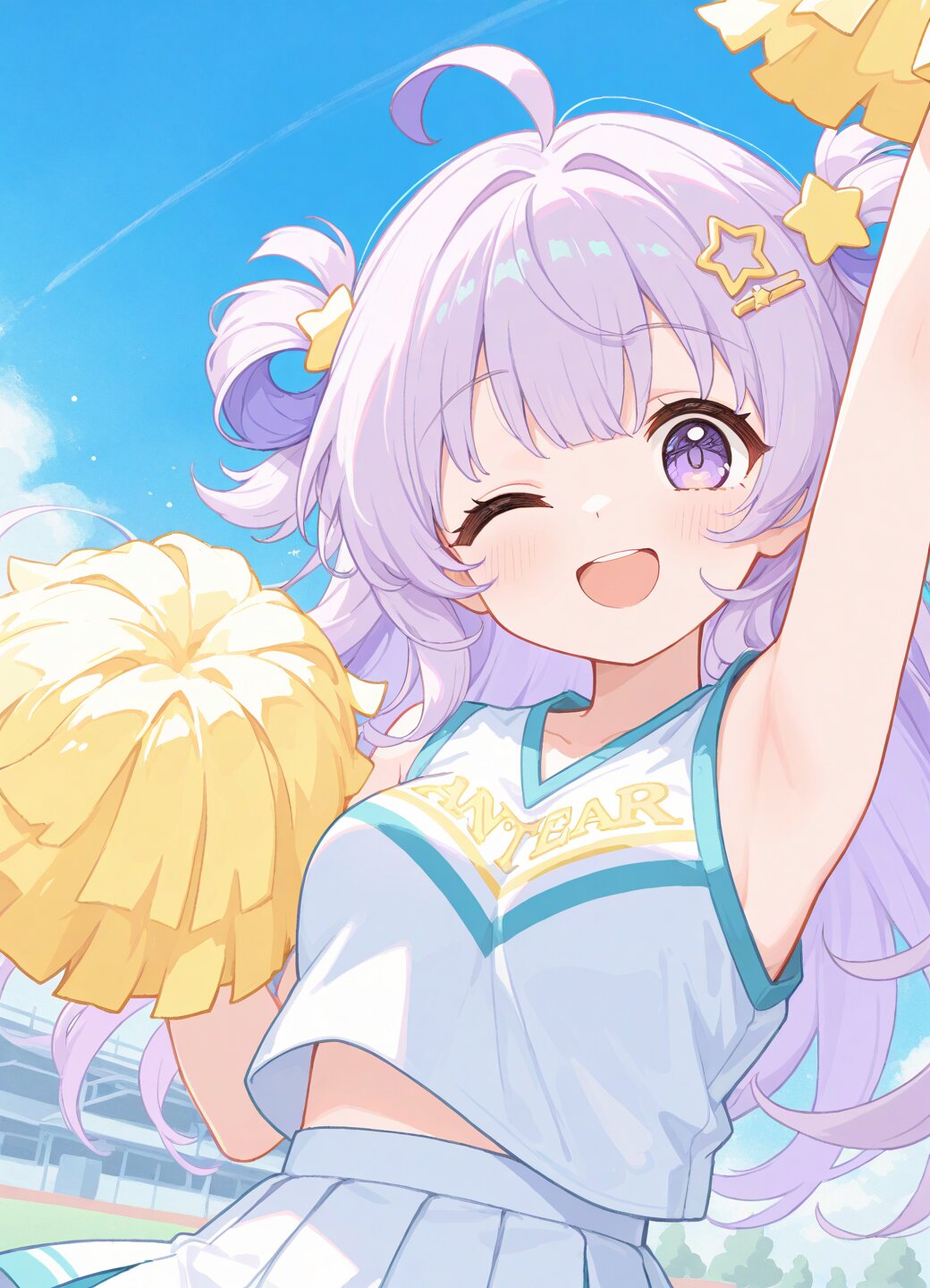 cheerleader uniform (lavender × white, pleated skirt, sleeveless top with stripe trim), holding pom-poms (pink & gold), dynamic cheer pose (mid-jump or one arm up), bright school gym or outdoor field, warm afternoon light, smiling face, no animals, masterpiece、best quality、amazing quality, solo, kawaii, cute, dynamic pose, dynamic angle, looking at viewer, Pastel color palette, (Upper body: 0.9), soft cute girl with soft lavender hair and light blue inner highlights, long hair with two side buns and loose curls, one stray hair, large, bright purple eyes, a gentle smile, a faint glow, anime-style with emphasized contours, flat pastel-toned shading.single ahoge, medium breasts,star-shaped hairpin,, (wink: 1.2), (a big smile:1.2), (soft pastel color palette:1.5), (pale colors:1.3), watercolor texture, matte finish, subtle shading, minimal contrast,