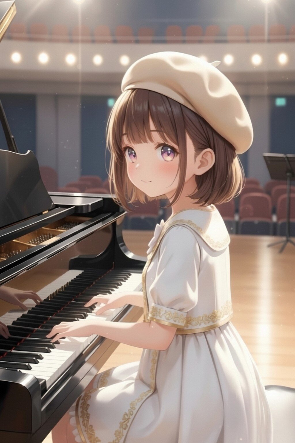 Anime style girl, 20s, short brown hair, wearing a white beret, white sailor dress, playing grand piano, smiling, beautiful expressive purple eyes, in a bright concert hall with audience chairs, stage lighting, beautiful detailed, high quality, studio lighting, extremely detailed CG, masterpiece
