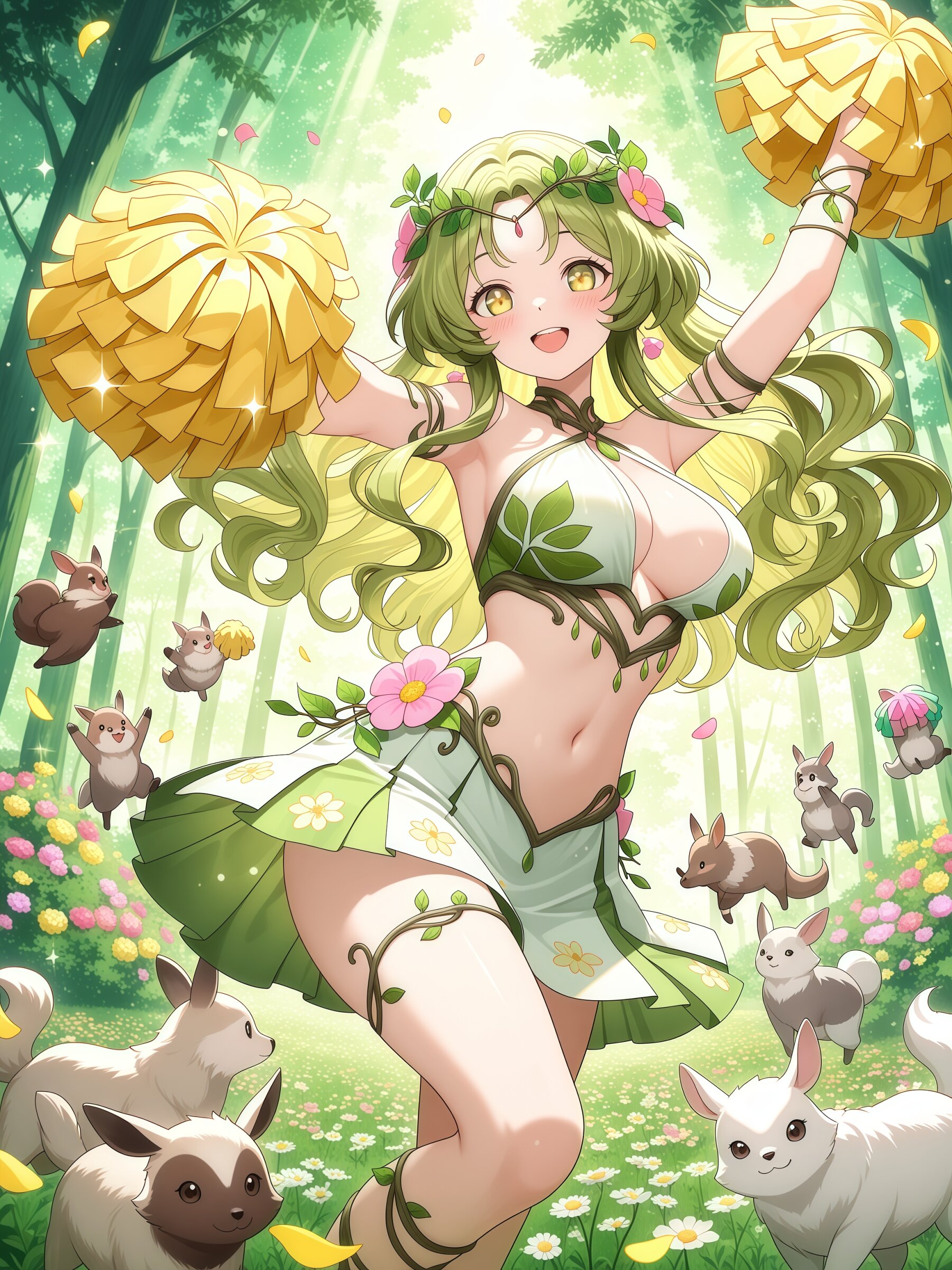 beautiful dryad girl, long wavy hair adorned with flowers, bangs, large breasts, navel, blush, serene smile, nature goddess vibe, looking at viewer, open mouth, dancing, cheerleader outfit, pom pom (cheerleading), floral dress adorned with countless colorful flowers and petals, elegant and radiant, BREAK (surrounded by small forest animals), too many animals, Flower Fields, soft golden and pastel lights, leaves gently fluttering, divine and enchanting atmosphere, soft sunlight filtering through the trees, sparkling particles in the air, lush green background, (masterpiece, best quality, ultra-detailed, anime style, fantasy illustration, 8k, ethereal lighting),