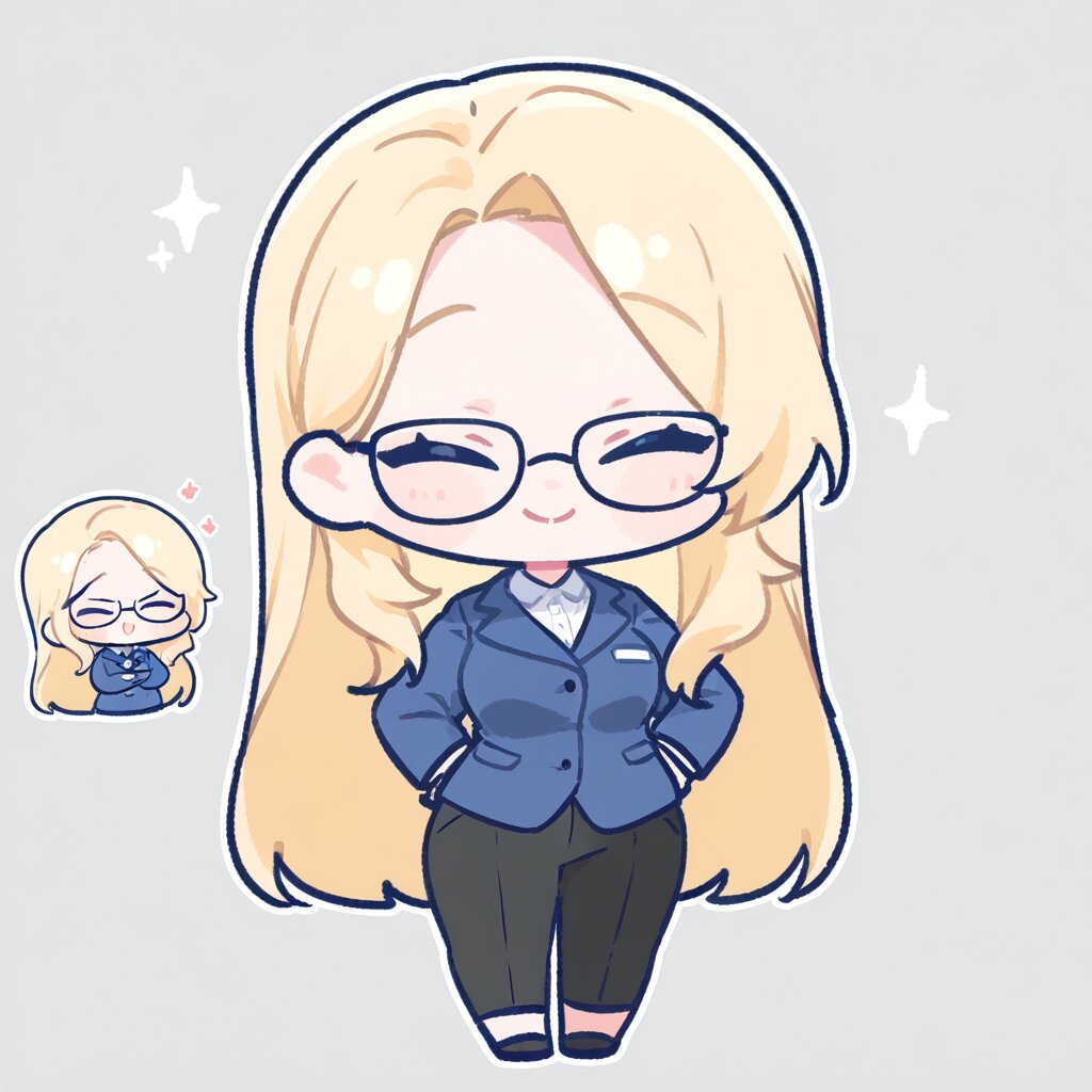(best quality),(masterpiece),(ultra detailed),1 lady, long hair, blonde hair, long hair, glasses,, smile ,,chibi,masterpiece,highres,absurdres,best quality