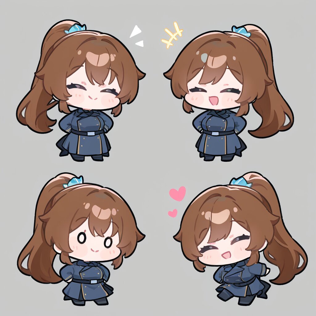 (best quality),(masterpiece),(ultra detailed),1 lady, long hair, brown hair, long ponytail, ,, smile ,,chibi,masterpiece,highres,absurdres,best quality