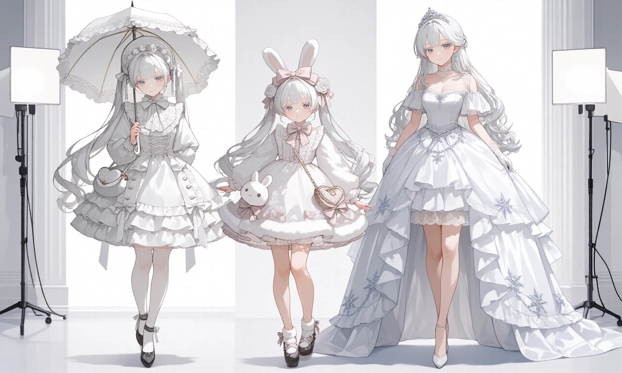 3パターンの白ロリ衣装プロンプトを載せておきます。