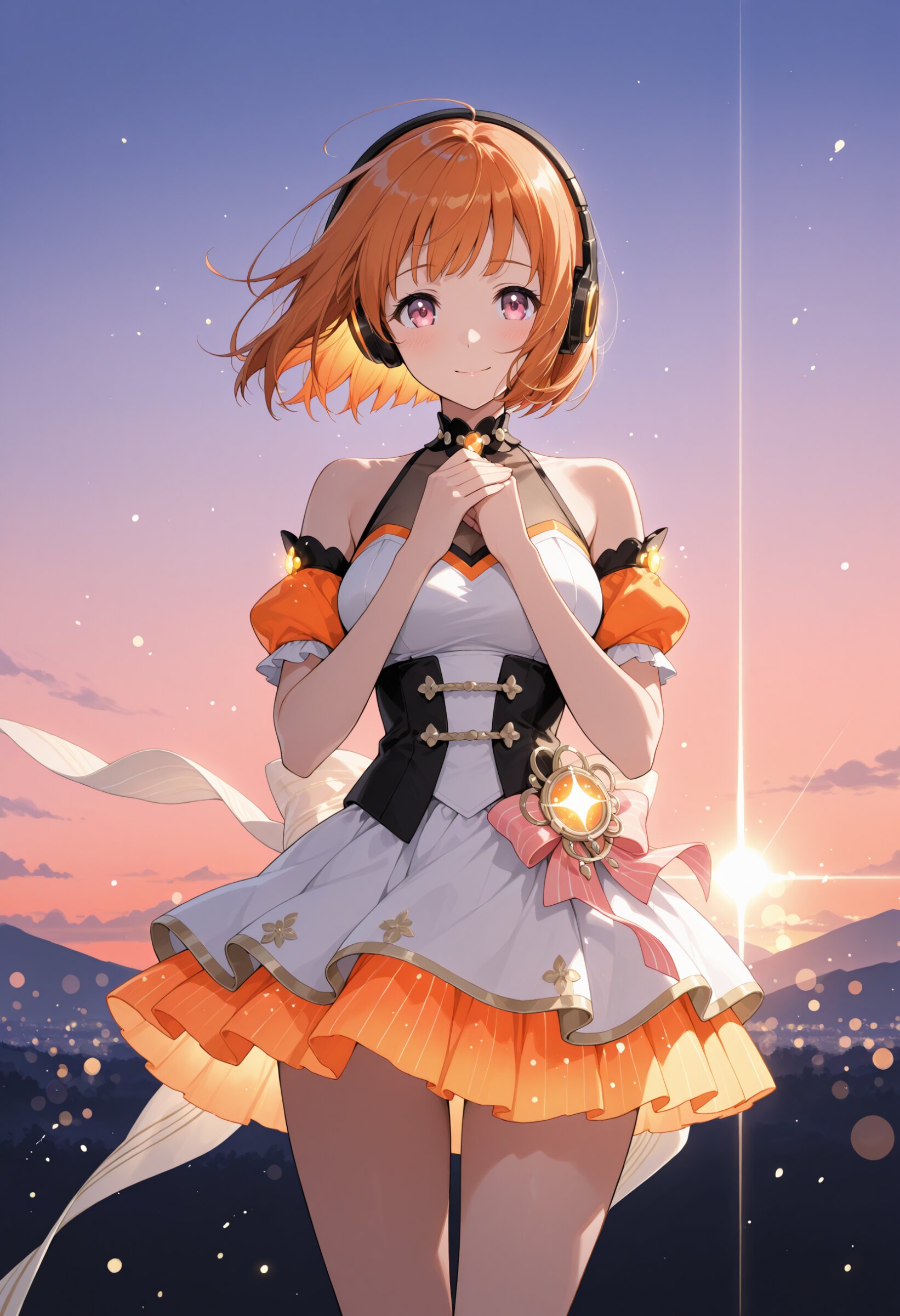 A delicate and beautiful full-body portrait of Zena, a Japanese idol with short orange bob hair and stylish headphones, standing gracefully against a breathtaking sunset sky. She wears a soft pastel idol outfit with open shoulders and a mini skirt, glowing gently in the warm orange and pink light of dusk. Her pose is elegant and emotional, as if embracing the fading sun, the wind softly moving her hair and skirt. The scene captures a moment between day and night — a symbol of hope and serenity. Ultra-detailed, cinematic lighting, soft bokeh, shimmering air particles, warm backlight, professional photography style, 8K resolution.