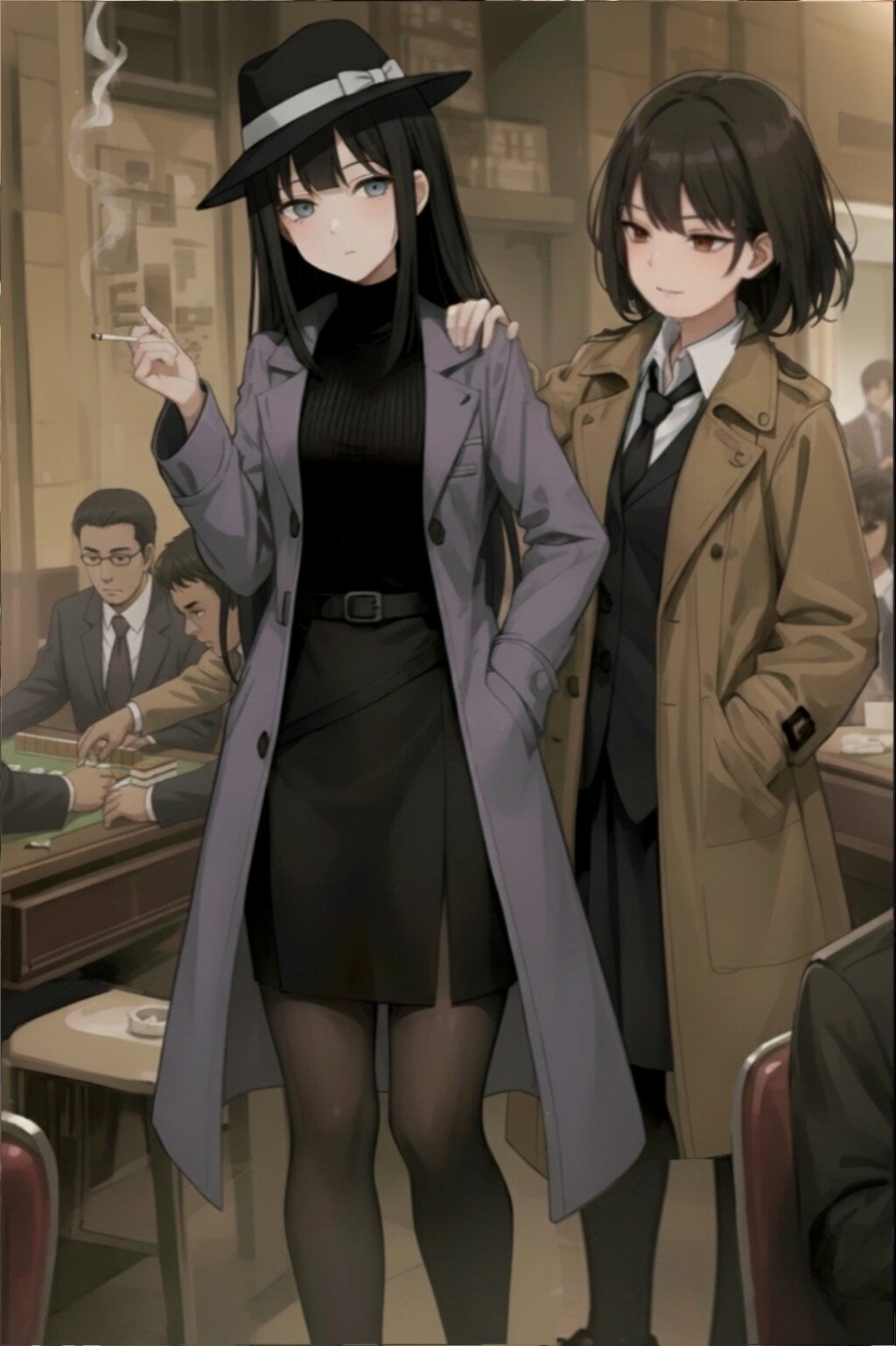 anime style, a young woman with long black hair, light blue eyes, wearing a black turtleneck sweater, a black tight skirt with a slit, and a light blue coat, holding a cigarette in her right hand, smoke rising from it. She has a slight smile. Beside her, another young woman with short messy black hair, brown eyes, wearing a worn trench coat, a suit, a dress shirt, and a tie. The second woman has her right hand on the first woman's shoulder and is smiling. They are in what appears to be a dimly lit establishment with other people in the background. The atmosphere is somewhat mysterious and cool.