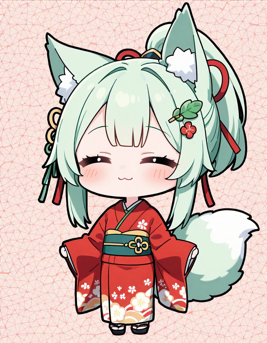 (chibi:1.4), flat chest,cute girl with fluffy fox ears and a large fluffy fox tail,wearing a casual red kimono with small floral patterns,mint green hair tied in a high ponytail with a delicate kanzashi hair ornament,blissful expression with eyes closed,