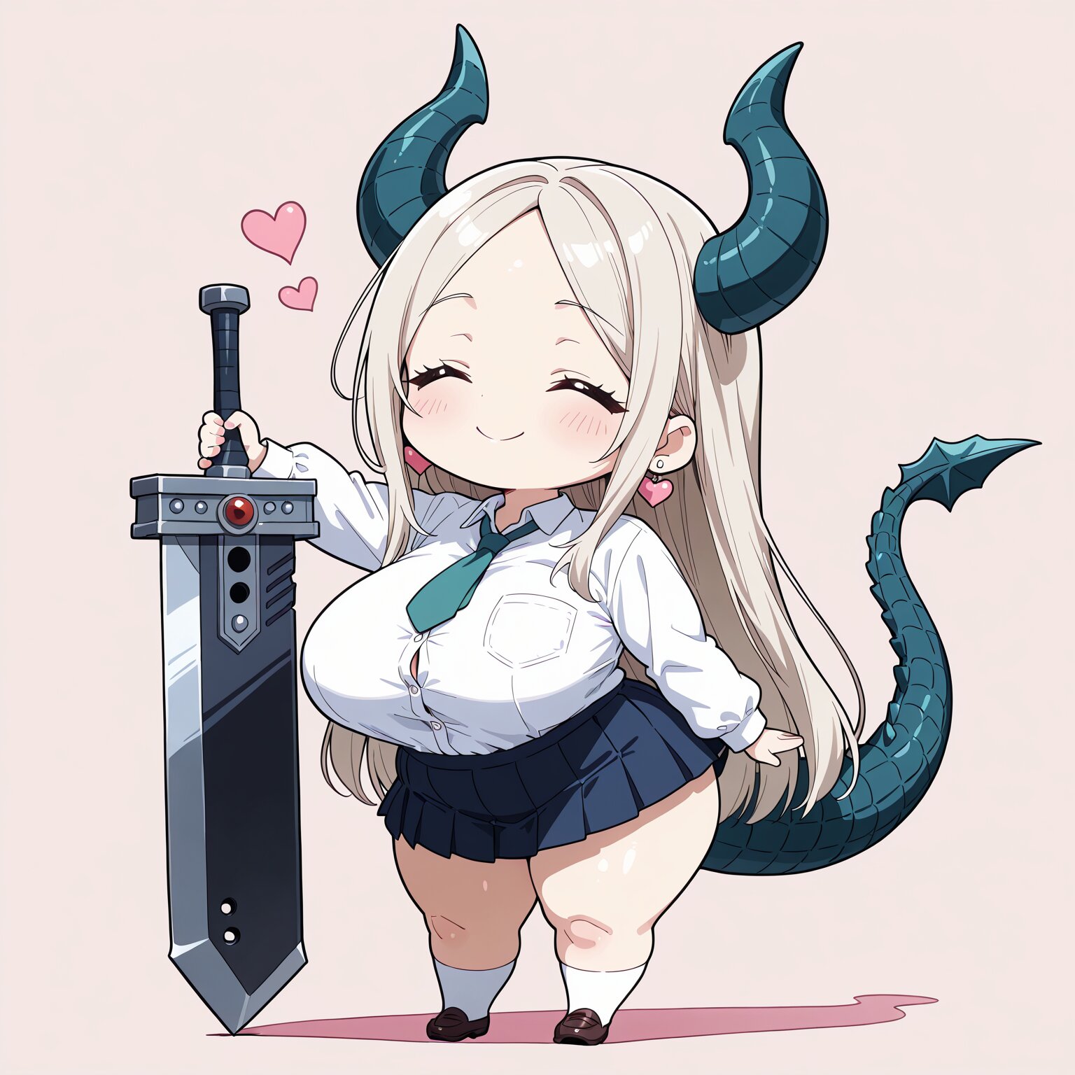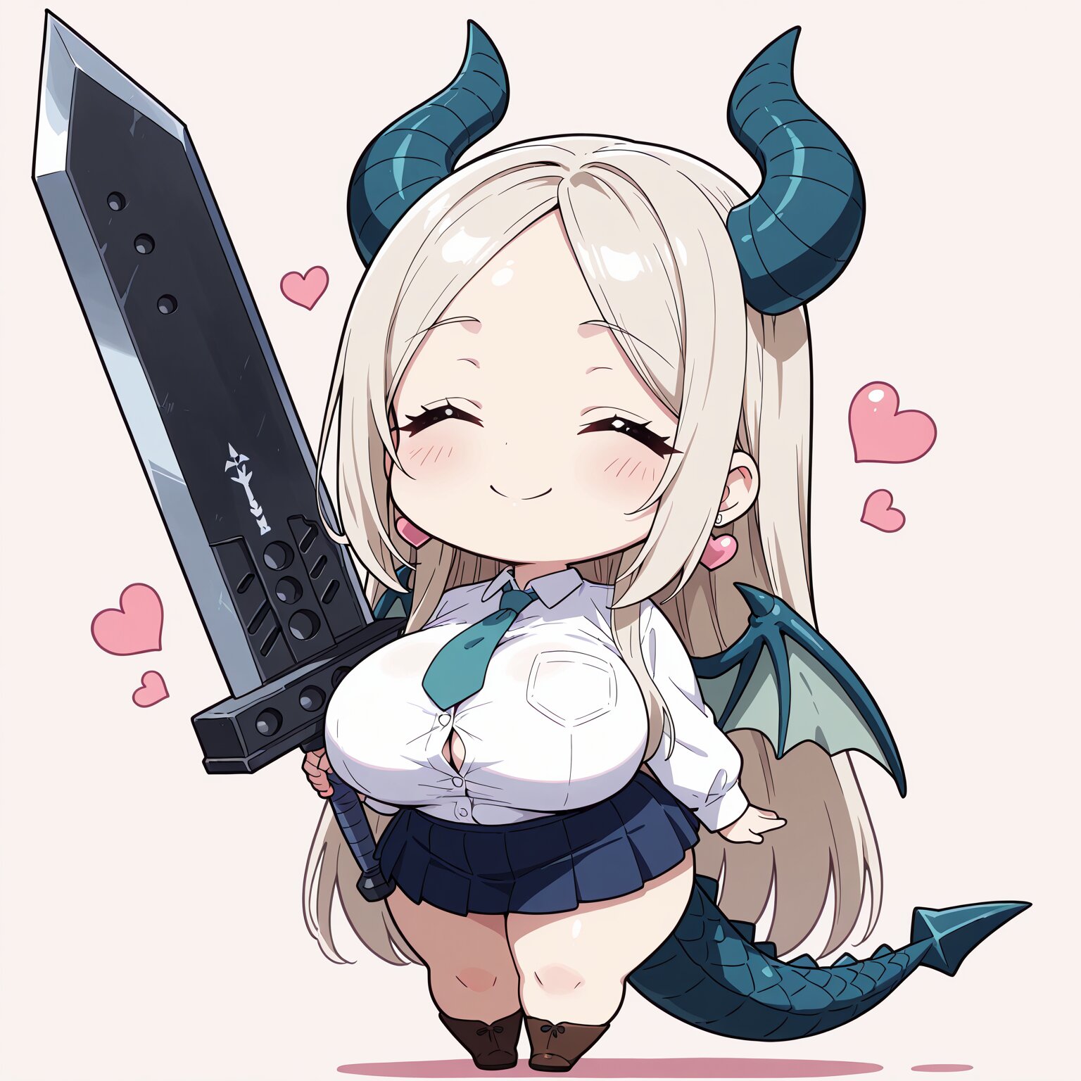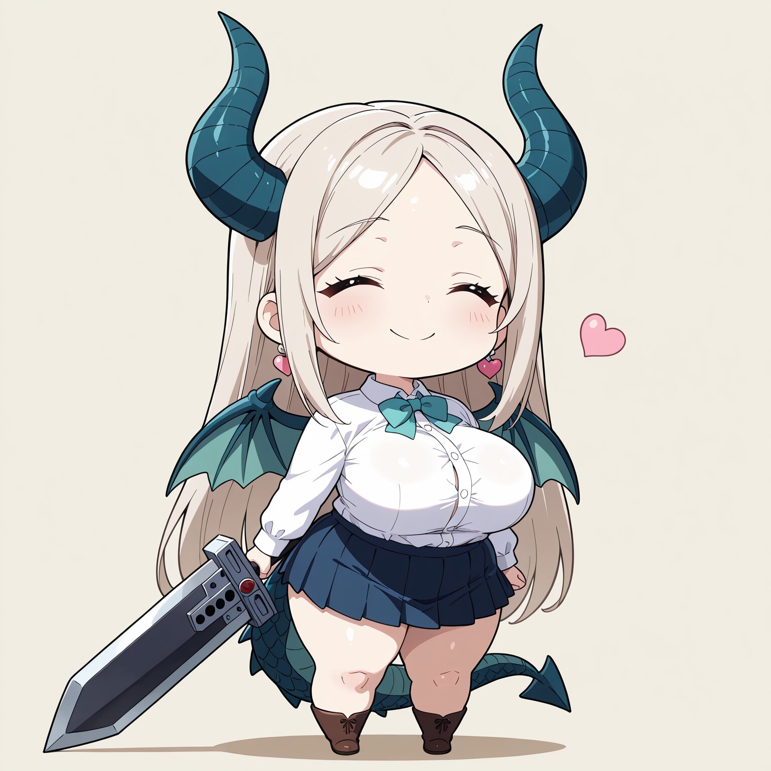 (1girl), (((chibi))) BREAK, (parted bangs, forehead, center-parted bangs) Platinum blonde hair, beautiful hair, beautiful eyes, green eyes, ((very long hair, abnormally long hair, straight hair:1.3)) (Adults, voluptuous bodies, very large breasts, heavy breasts, long breasts, round breasts:1,2), fat, loose stomachs, thick thighs,, thick thighs, heart earrings, (((eyes closed))), (smiling:1.2) Dress shirt, miniskirt, pleated skirt, (black Dragon horns, black dragon tail, dragon wings) (Greatsword, buster sword, giant sword, luxurious sword) BREAK, (((No background: 1.3)))