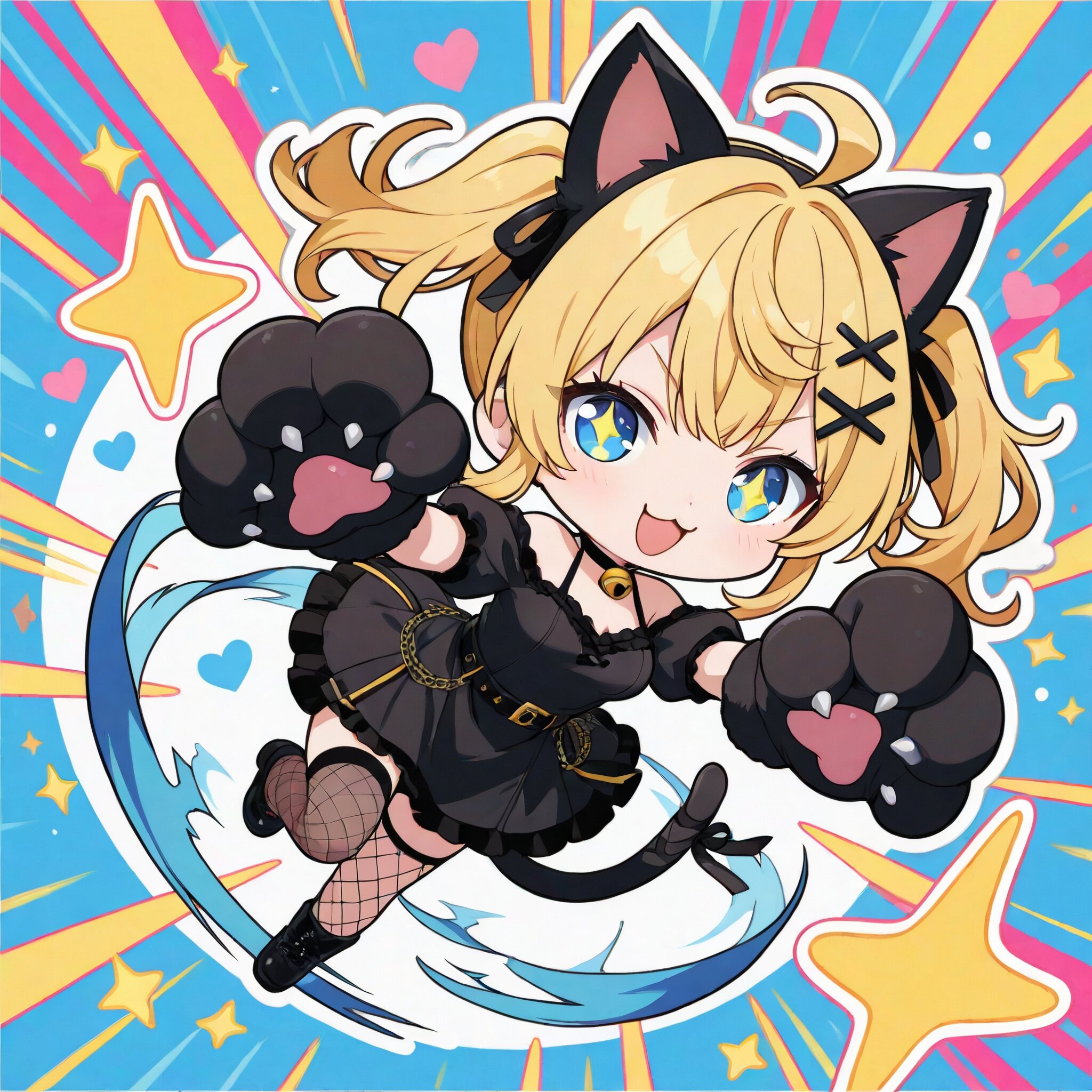 (masterpiece, best quality, ultra-detailed, anime style, dynamic motion, full body, flat color), (solo focus:1.2), 1girl, (chibi:1.4), blonde medium hair, twin tails, blue eyes, medium breasts, black dress, bare shoulders, off shoulder, belt, puffy sleeves, black gloves, bell choker, paw gloves, black cat ears, asymmetrical thighhighs (left leg fishnet, right leg black), catlike jump attack pose, leaping forward dynamically, both hands forward, arms stretched forward, pouncing with playful energy, sparkling eyes, :3, :d, open mouth, floating hair and ribbons, motion lines, playful energy, strong sense of action, white outline, comic-style background, stars and hearts around, playful sparkles, pop tone effects
