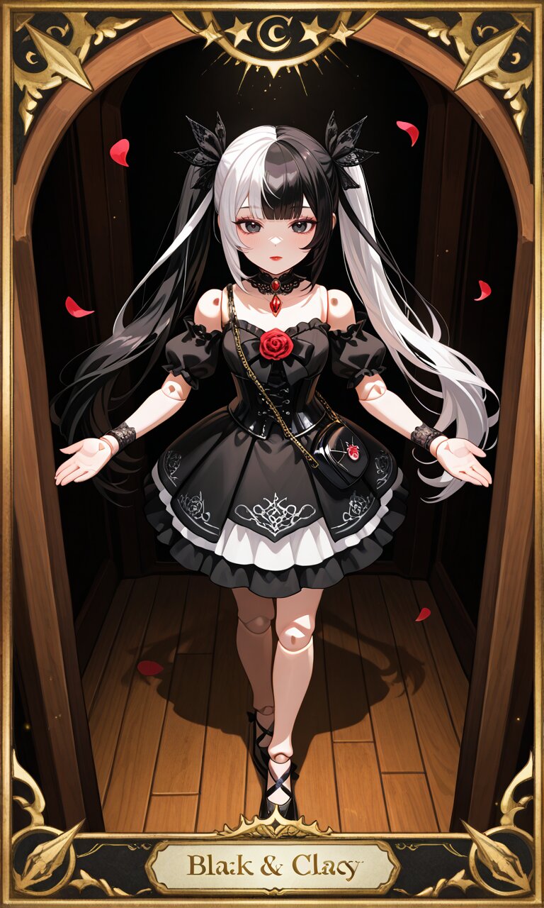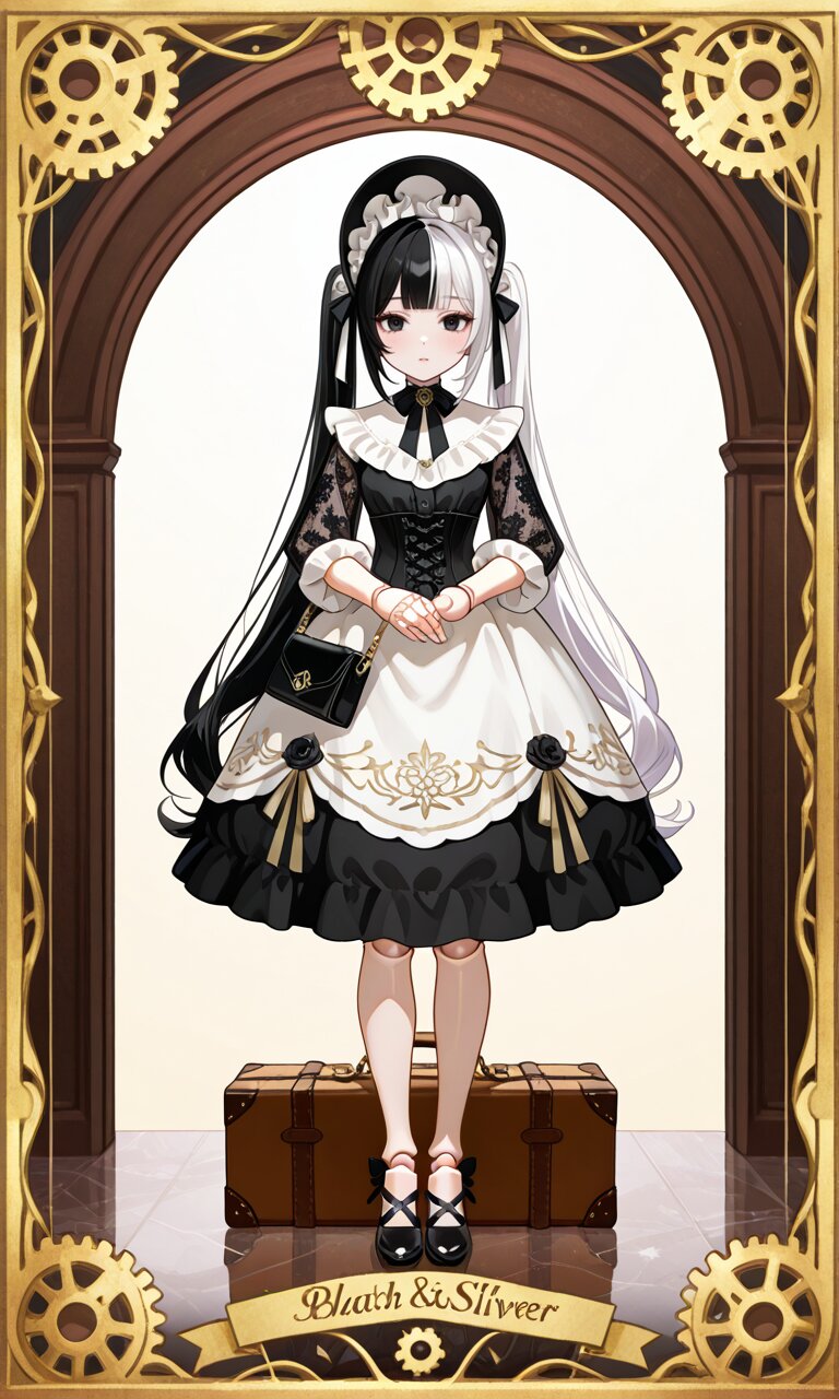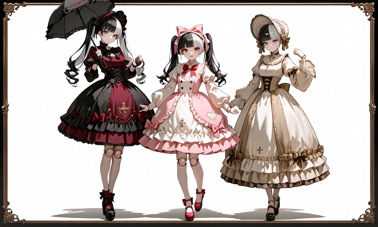 ① pastel pink and white sweet lolita crystal dress, ornate fantasy doll outfit, bell-shaped skirt made of translucent resin and lace, layered organza frills, oversized satin ribbons, heart-shaped buttons, pearl accents and lace trim, puff sleeves with iridescent shimmer, large crystal bow headband, transparent heart-shaped handbag filled with pearls and glitter, pearl jewelry, satin lace gloves, decorative ribbons around the waist, candy-like embellishments, delicate and glossy fabric texture, high-detail doll fashion design ② ivory and faded gold antique baroque lolita dress, mechanical doll couture, corset decorated with brass filigree and lace embroidery, long bell lace sleeves, high collar with cameo brooch, vintage lace bonnet veil with golden trim, skirt embroidered with clockwork and floral motifs, faint opal gemstone decorations, miniature suitcase-style handbag designed like a golden music box with brass details, lace gloves, gold jewelry and metallic ornaments, soft layered fabrics, refined antique luxury style, detailed baroque doll lolita fashion