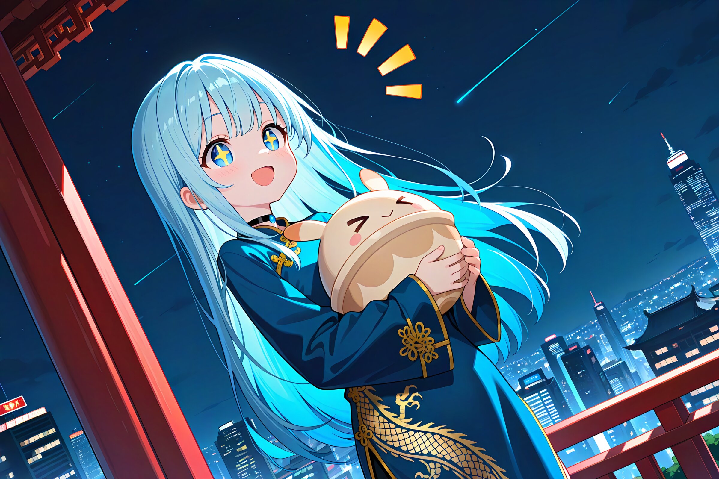 1 little girl, solo, diagonal angle, masterpiece, best quality, amazing quality, very aesthetic, sky blue hair, long hair, straight hair, blue eyes, +_+, open mouth, smile, cheerful, +++, notice lines, choker, china dress, taiwan, long cheongsam, elegant, glowing atmosphere, long sleeves, holding humpty dumpty, > <, taipei 101, night, taiwan, night view,