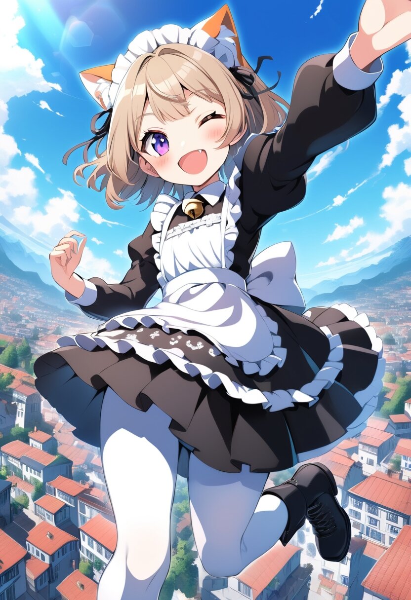 1girl, solo, 15years old, looking at viewer, sidelocks, short hair, light brown hair, open mouth, violet eyes, calico ears, (calico tail), long sleeves, puffy sleeves, bow, frills, black dress, collar, maid headdress, black ribbon, bell, white apron, maid apron, frilled apron, white pantyhose, collared dress, boots, shoes, black footwear, blush, smile, outdoors, one eye closed, fang, at noon, town, cloud, sunshine, ((illusion effect)), flying,