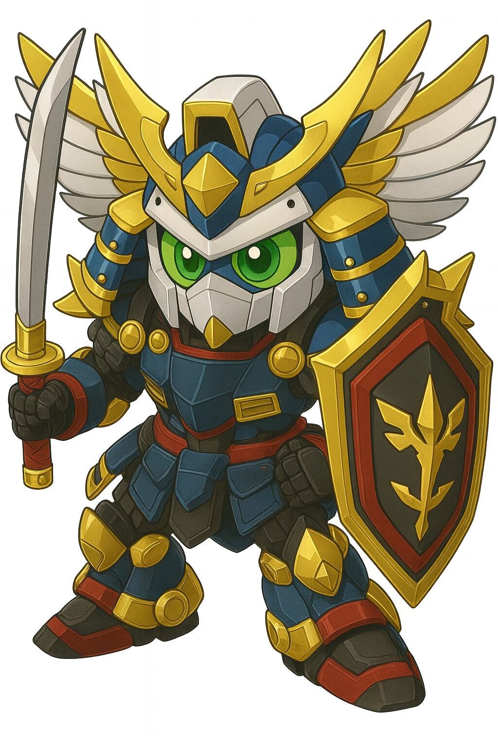 鎧色:深蒼を基調とし、随所に金と白の神聖装飾。