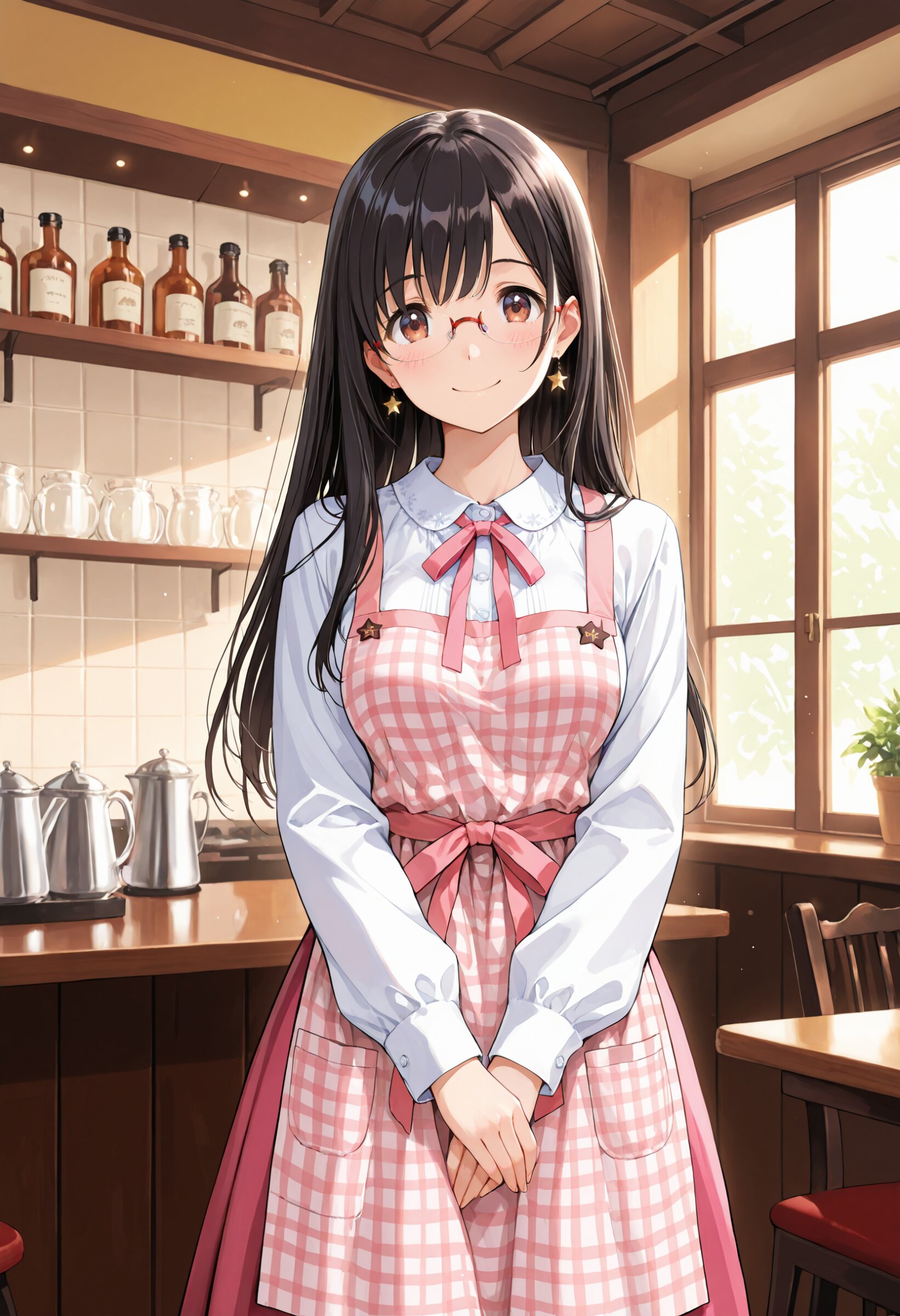 1girl, 17 years old, 155cm tall, brown eyes are shining and cute, black hair, long hair, extremely detailed neat hair,Straight hair, tareme, ((red semi-rimless eyewear:1.2)), star earrings, medium breasts, smile, blushful, happy, compassion,serveing, cafe, white blouse, pink ribbon, checkered clothes, Apron dress, pink skirt, masterpiece, best quality, ultra-detailed, 4k, 8k, finely detailed, highres, anime, intricate, soft lighting, sharp focus, beautiful, detailed clear line art, detailed background, in a fashion sketch or comic art style