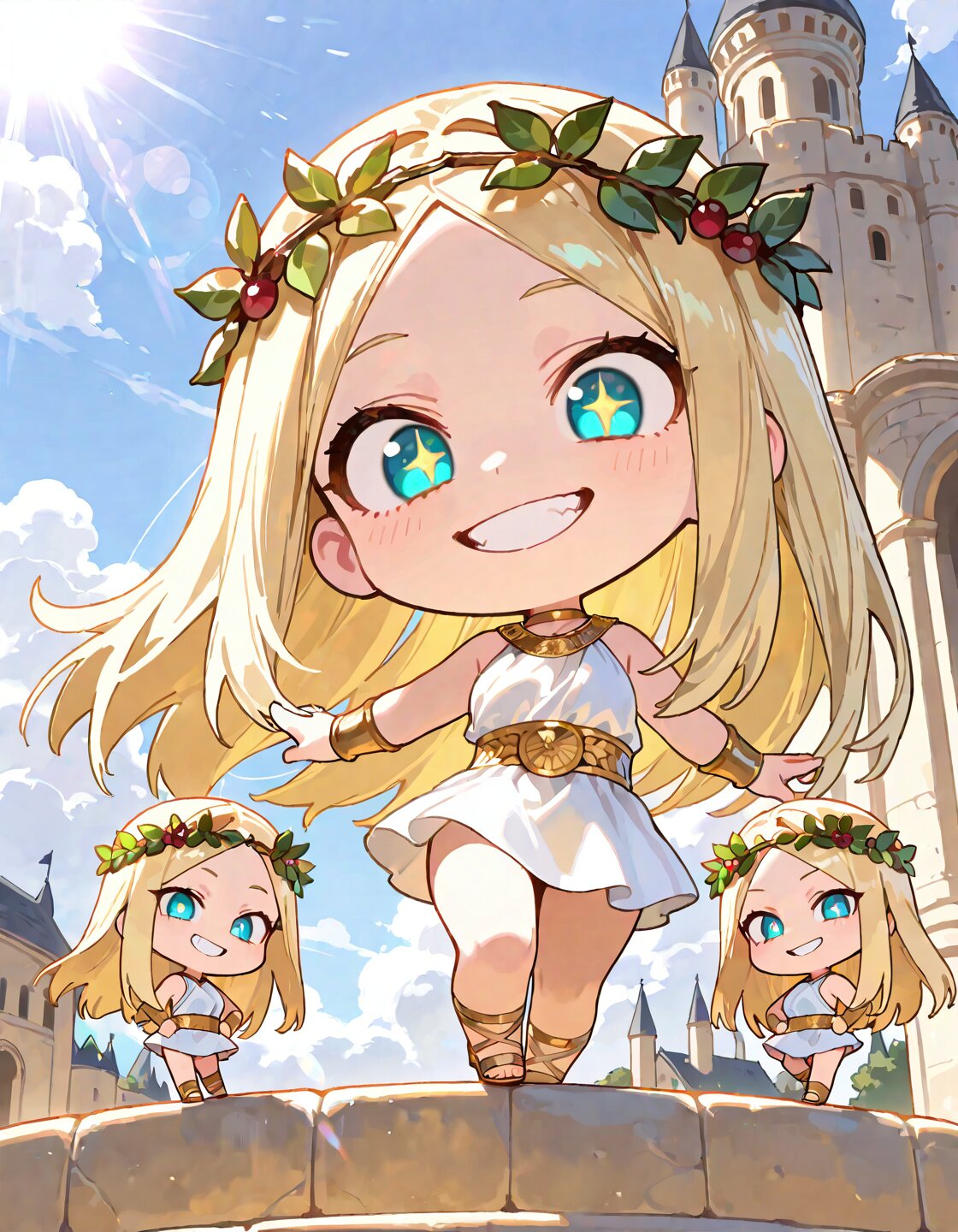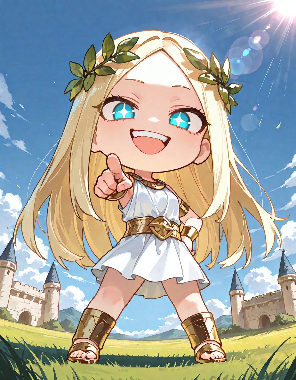 solo,long hair,straight hair,forehead,center parted bangs,hair ornament,blonde hair,delicate face,detailed face,detailed skin,masterpiece,best quality,insanely detailed,beautiful,8k,beautiful eyes,cheerful,looking at viewer,mini skirt,olive wreath,wearing a greek mythology white costume,gold Gladiator sandal,ancient Greece,shining lights,evil grin,in the afternoon,sunlight,lens flare,outside,ancient castle,classic academia,sunbeam,the ancient castle,Evil grinning,standing,from below,wide view,(pointing forward:1.2),fighting stance,finger pointing,pointing at viewer,screaming,smug,open mouth,staring,grassland,blue sky,lensflare,(chibi:1.5),deformed