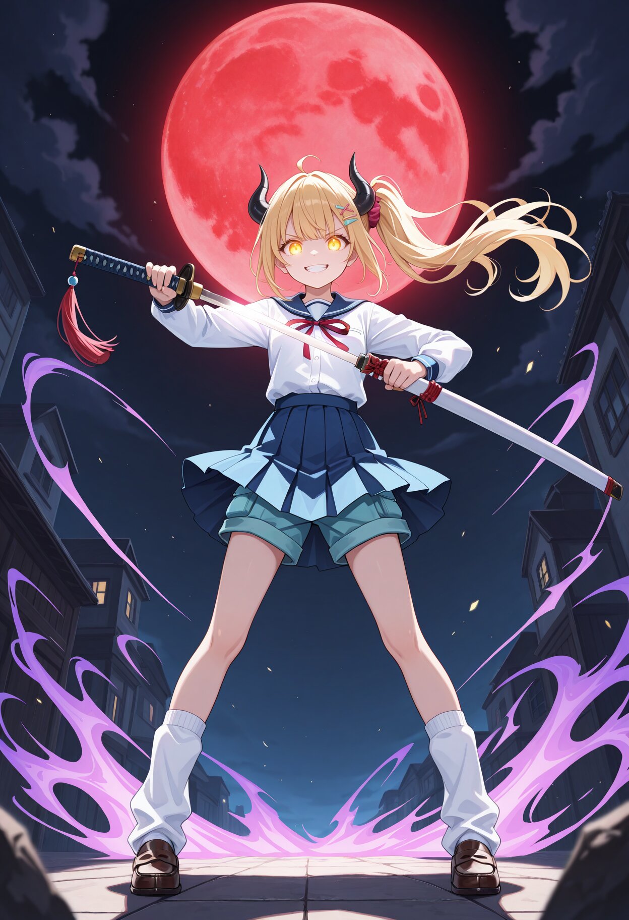 (katana Unsheathing:1.2),1girl,solo,17yo,(two demon horns,black horns,side ponytail:1.2),demon girl,small breasts,long sleeves,blonde hair,long hair,bangs,hair scrunchie,colorful hairclip,yellow eyes,glowing eyes,angry,smile,grin BREAK school uniform,long white blouse,red chest ribbon,(blue pleats skirt,wearing loose half-length cargo shorts under skirt,blue cargo shorts:1.2),loafers,loose socks BREAK smiling and angry onibi,looking at viewer,dark aura,night school background,night,red moon,standing,full body,fantasy BREAK masterpiece,best quality,highres,ultra detailed,best quality,ultra detailed,extremely detailed,8k,Highly Detailed,beautiful,high resolution,general,
