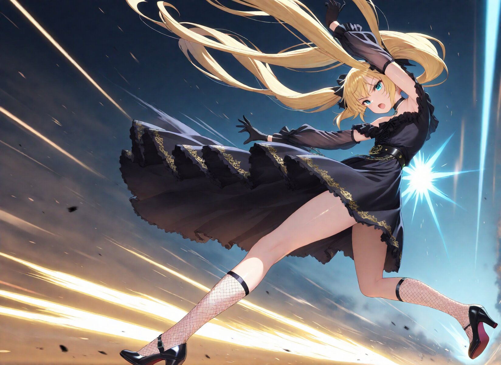 dynamic angle,(1 girl:1.4),solo,full body,floating hair,floating clothes,floating skirt,open mouth,loli,aqua eyes,tsurime,aggressive expression,blonde hair,long hair,twin tails,black tie, black long gothic dress,Gold embroidery on the dress skirt,off shoulder,belt,puffy sleeves,black gloves,black choker,Fishnet stockings,high heels, action lines,motion blur,(vertical elliptical shockwave effect near the left arm:1.2),(best quality,masterpiece:1.4),(high resolution,super fine illustration:1.36),shiny skin,finely,detailed face,japaneese idol,