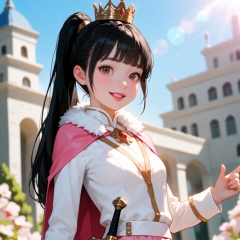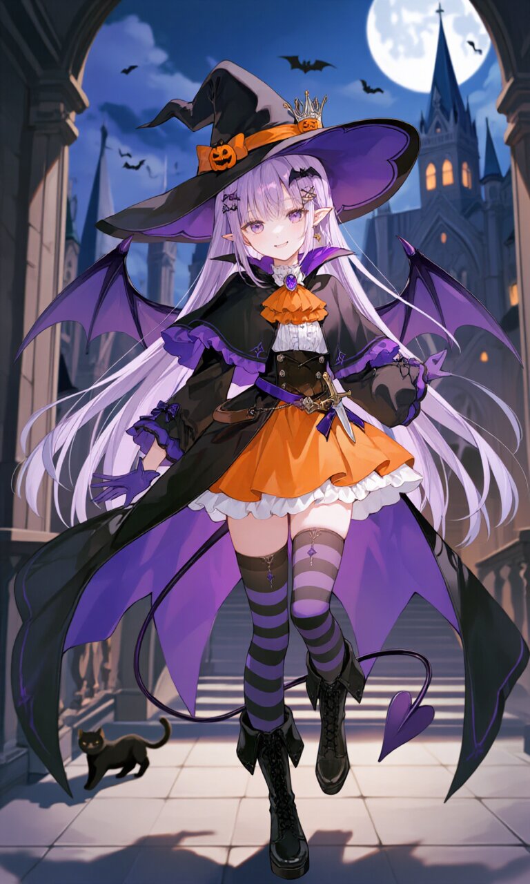 A young witch girl with delicate features stands in a gothic palace courtyard at midnight, bathed in soft moonlight. She has light purple, very long straight hair with medium bangs, adorned with a left bat hair ornament and mini pumpkin decorations. Her purple eyes gleam with mischief, complemented by pointy ears and subtle fangs as she smiles with closed lips. She wears a (Black Prince costume with purple trim:1.5) with long sleeves, (purple gloves:1.2), and an (orange lace jabot with amethyst brooch). Her outfit includes a (luxurious orange mini skirt:1.3), white-and-purple striped thighhighs, and (black luxurious boots:1.3). A black witch hat with an orange ribbon sits atop her head, and her devil's tail—a heart-shaped purple appendage—curves playfully behind her. Fake wings extend from her back, adding to her supernatural charm. She carries a (dagger on waist:1.3) and wears a (crown:1.3), enhancing her regal yet mischievous aura. The background features intricate gothic architecture, fluttering bats, and a black cat lurking nearby, reinforcing the Halloween atmosphere. The scene blends romantic academia aesthetics with dark fantasy, emphasizing rich textures in her capelet (multicolored with purple highlights) and the palace's ornate stonework. The lighting casts dramatic shadows, highlighting every fine detail of her costume and the eerie yet enchanting midnight setting.