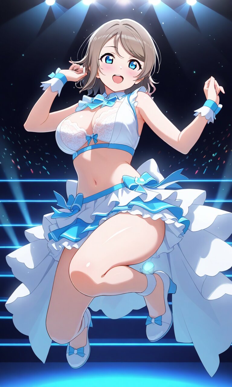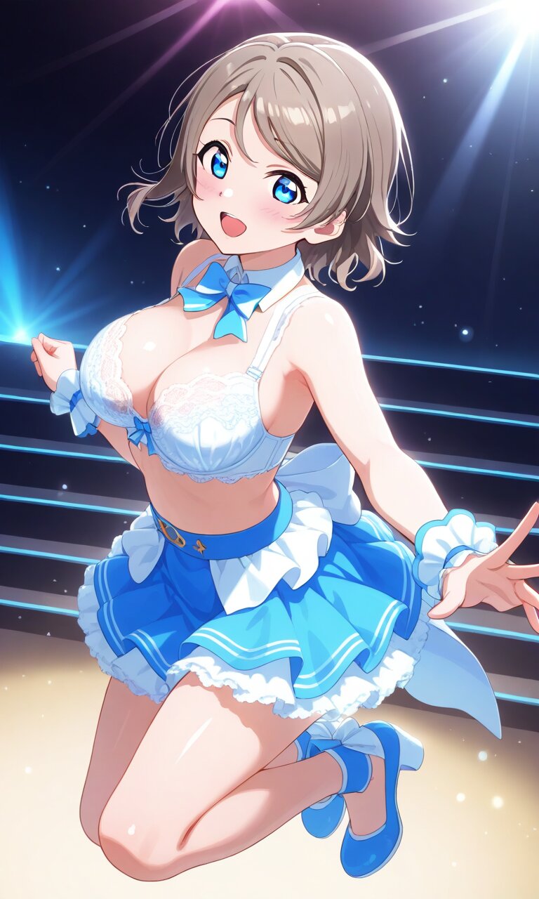 you watanabe, blue eyes, brown hair, short hair, swept bangs, large breasts, best quality}, {very aesthetic}, {ultra-detailed}, {best illustration} nsfw, perfect hands, perfect face, perfect eyes, perfect light, dynamic light, natural light, full body NSFW, masterpiece, best quality, extremely detailed, beautiful detailed girl, excited expression, shiny skin, on illuminated stage, idol outfit dissolving into glowing light particles layer by layer, top partially vanishing revealing lace bra, skirt fading at edges, magical transformation effect, spotlights, perfect anatomy