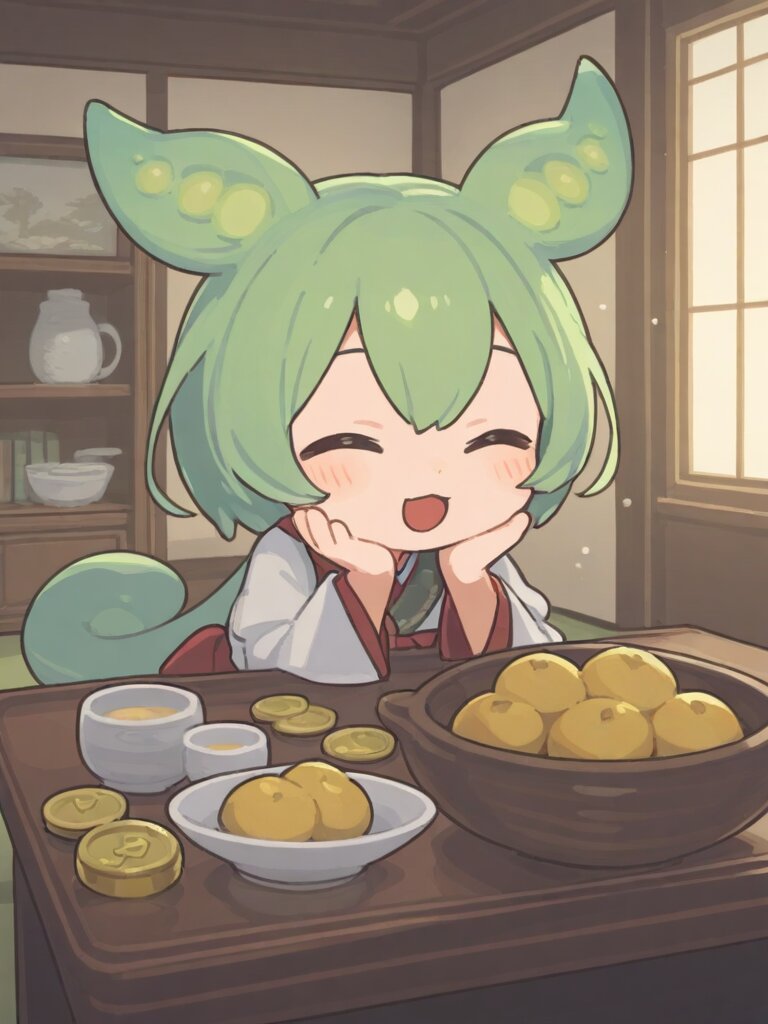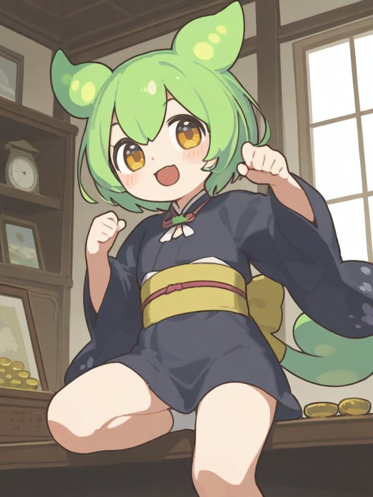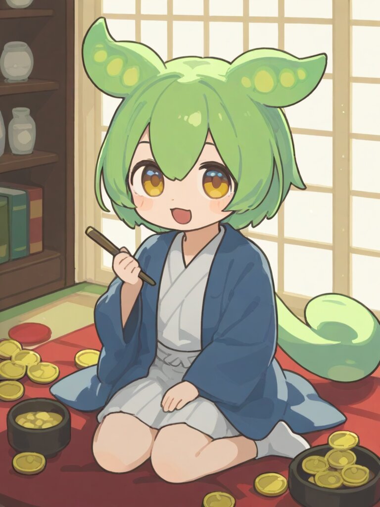 zundamon,voicevox Coin collector, antique room, large number of ancient Japanese coins, looking at with a smile