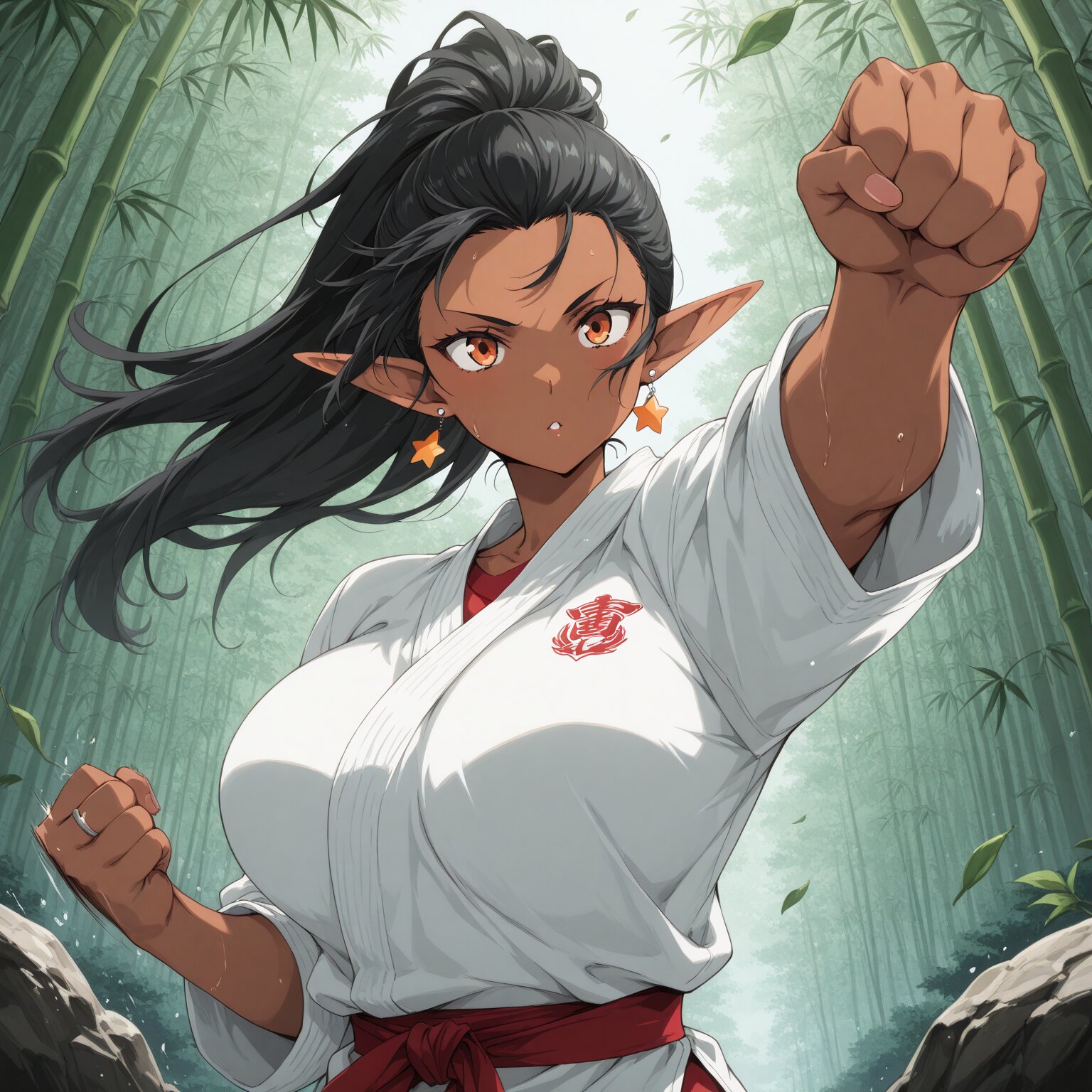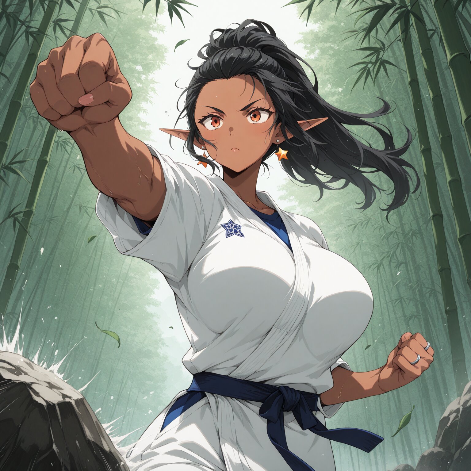 1girl, BREAK, Elf, Adult, voluptuous body, ponytail, hair pulled back BREAK, black hair, long hair, sharp bangs, ((dark skin:1.2)), BREAK, narrow eyes, (orange eyes) huge breasts, large breasts, soft breasts, (muscular, toned body, athletic build) star earrings, ring earrings judo wear, Clenching a fist, punching, hitting a rock, bamboo forest, wind blowing, leaves fluttering (Raising fist, extending arm) BREAK, ((newest, year 2024, anime, animation, anime screen capture, anime style:1.3)) BREAK, ((masterpiece, , vibrant, very aesthetic, highly detailed, best quality, 16k:1.3)) Perfect hands, perfect fingers,