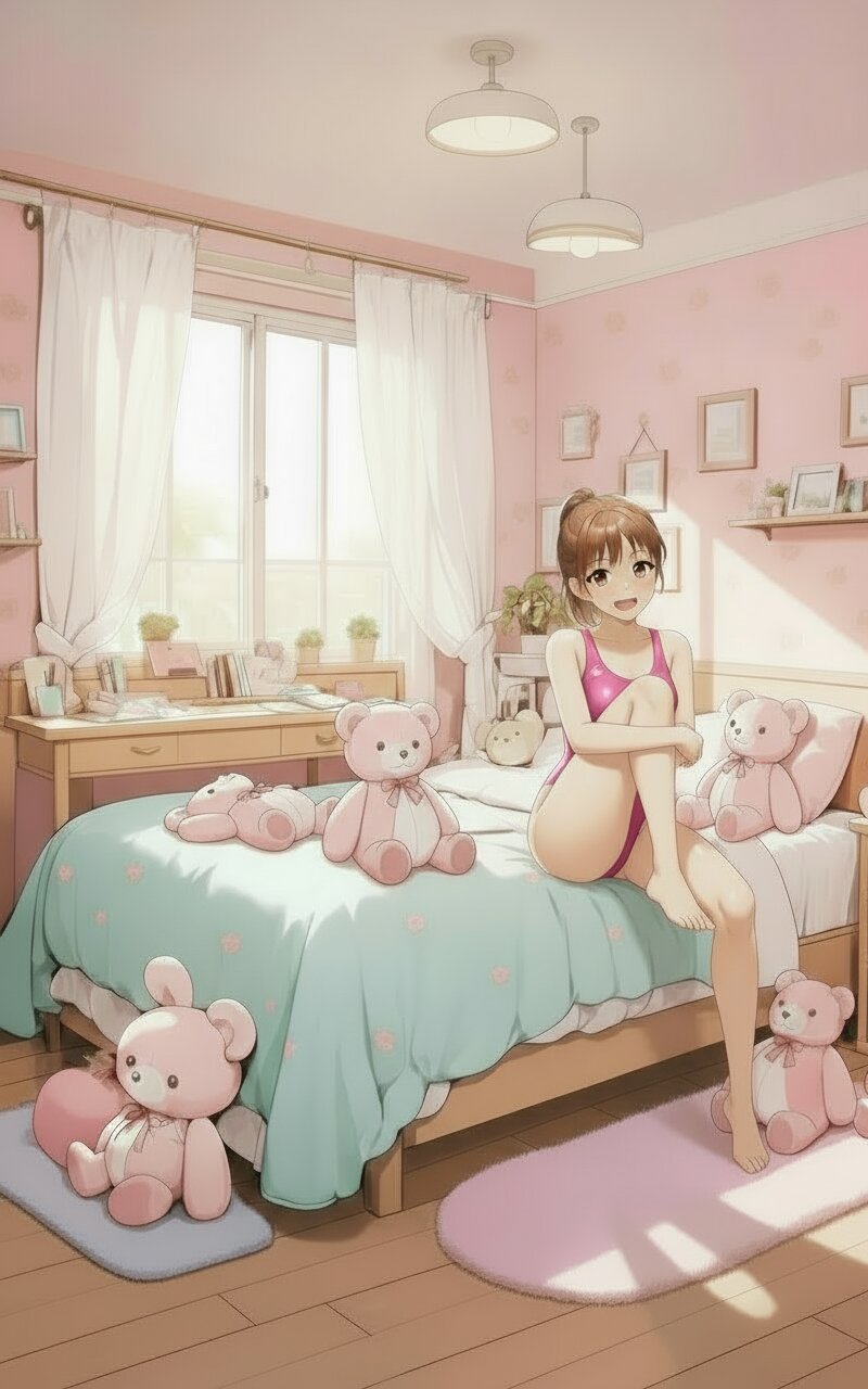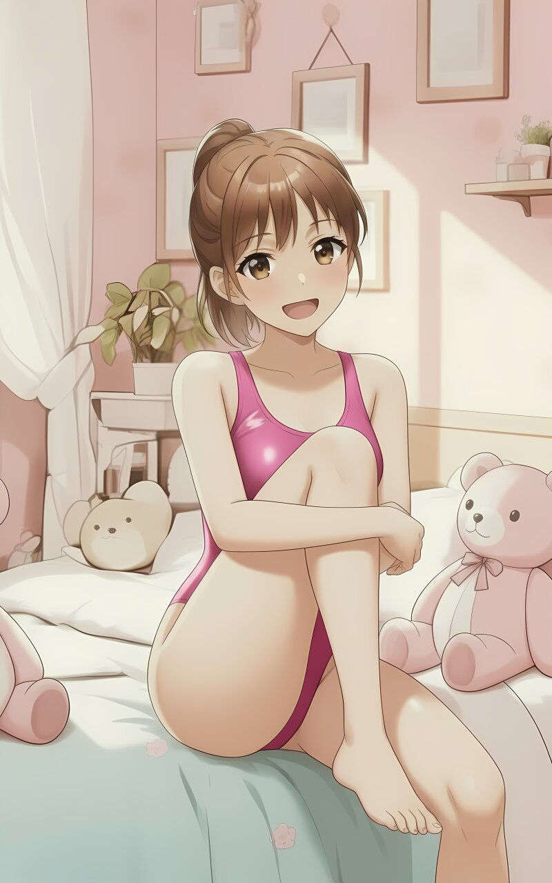 Fancy girl: A cute girl with brown hair tied in a ponytail, wearing a shiny pink competitive swimsuit, sitting on the bed in a pink bedroom filled with teddy bears. Soft lighting, smiling, eyes open, sitting on the bed and hugging one knee, cute pose. Fancy room: masterpiece, best quality, no girl, girl's room