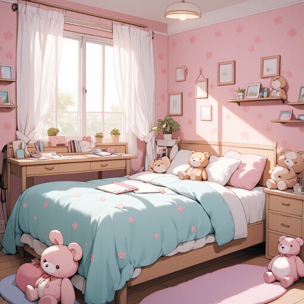 女の子はモデル:Haruka V2 (PixAI official)、部屋はTubaki V1(PixAI Official)です。