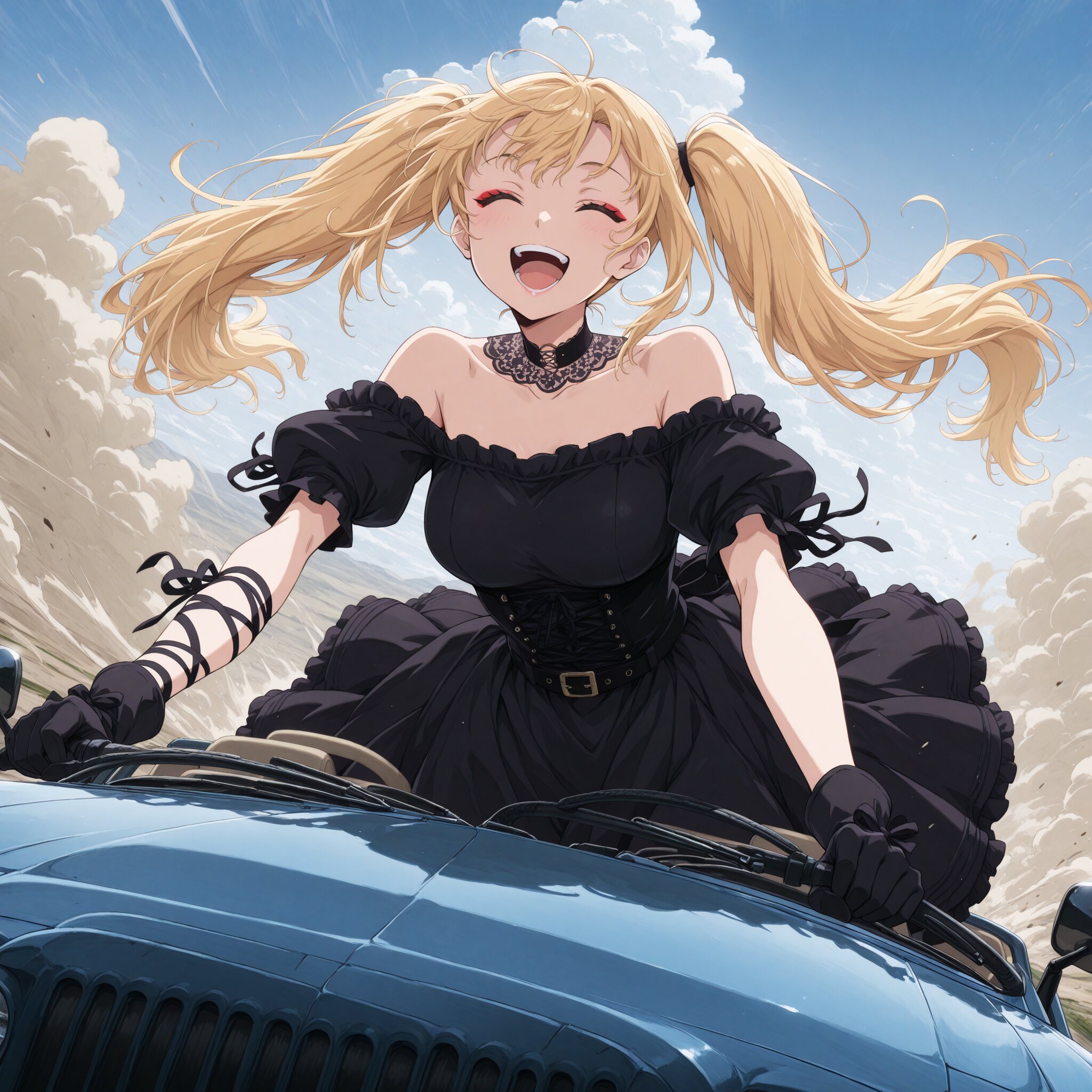 (1girl), ani, twintails, blonde hair, makeup, blue eyes, choker, bare shoulder, gothic dress, arm ribbon, black gloves, asymmetrical legwear (Eyes closed), mouth open, laughing Wilderness, jeep, car, convertible, driving, speeding, dust clouds BREAK, ((newest, year 2024, anime, animation, anime screen capture, anime style:1.3)) BREAK, ((masterpiece, , vibrant, very aesthetic, highly detailed, best quality, 16k:1.3)) Perfect hands, perfect fingers,