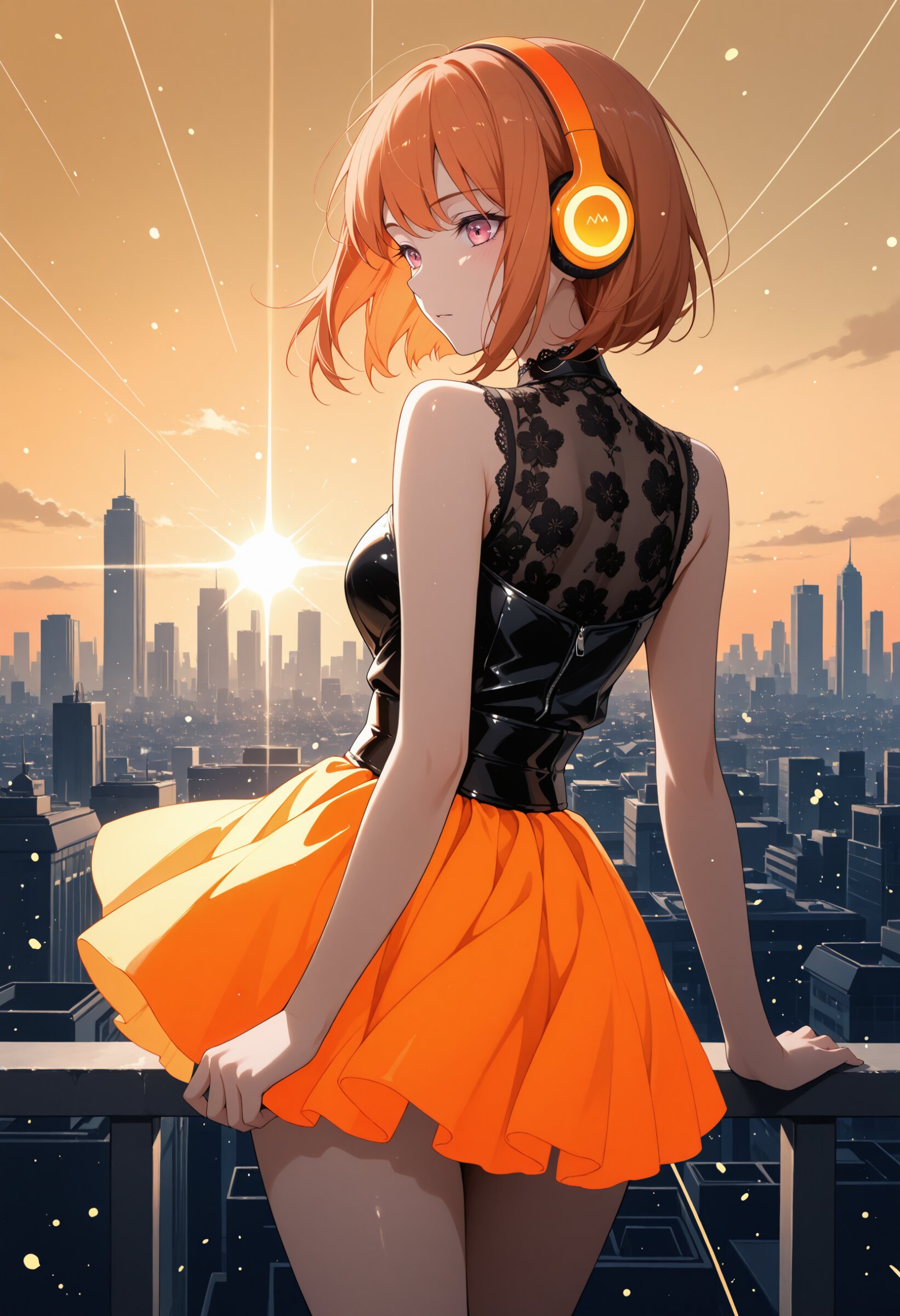 Prompt: anime style, beautiful Japanese idol girl Zena:1.3, short orange bob hair:1.4 softly illuminated by the sunset glow, wearing pastel orange headphones:1.3 that shimmer gently in the light. Her outfit is a futuristic idol dress:1.3 in orange and black tones, with open shoulders and a mini skirt, detailed with delicate lace and soft leather textures. The subtle neon lines on her outfit glow tenderly, blending harmoniously with the warm golden sky. She stands on a rooftop overlooking a futuristic city, bathed in the soft orange and pink hues of the evening sun. Her expression is gentle yet confident, eyes reflecting kindness and quiet strength. A breeze lifts her hair slightly as the sun dips below the skyline, scattering particles of light around her like drifting stars. The atmosphere captures a moment between day and night — nostalgic, beautiful, and full of hope. cinematic anime lighting, soft focus, delicate color balance, glowing reflections, ultra-detailed fabric textures, emotional composition, masterpiece.
