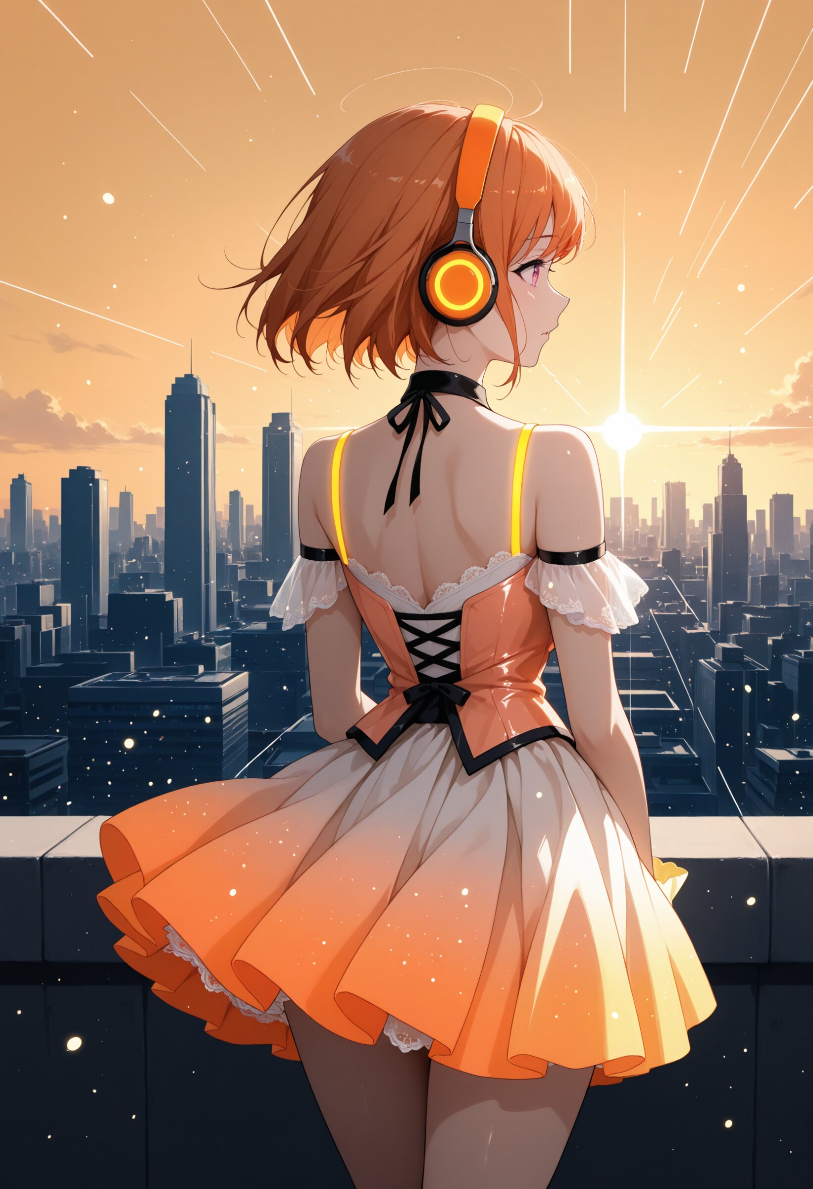 Prompt: anime style, beautiful Japanese idol girl Zena:1.3, short orange bob hair:1.4 softly illuminated by the sunset glow, wearing pastel orange headphones:1.3 that shimmer gently in the light. Her outfit is a futuristic idol dress:1.3 in orange and black tones, with open shoulders and a mini skirt, detailed with delicate lace and soft leather textures. The subtle neon lines on her outfit glow tenderly, blending harmoniously with the warm golden sky. She stands on a rooftop overlooking a futuristic city, bathed in the soft orange and pink hues of the evening sun. Her expression is gentle yet confident, eyes reflecting kindness and quiet strength. A breeze lifts her hair slightly as the sun dips below the skyline, scattering particles of light around her like drifting stars. The atmosphere captures a moment between day and night — nostalgic, beautiful, and full of hope. cinematic anime lighting, soft focus, delicate color balance, glowing reflections, ultra-detailed fabric textures, emotional composition, masterpiece.