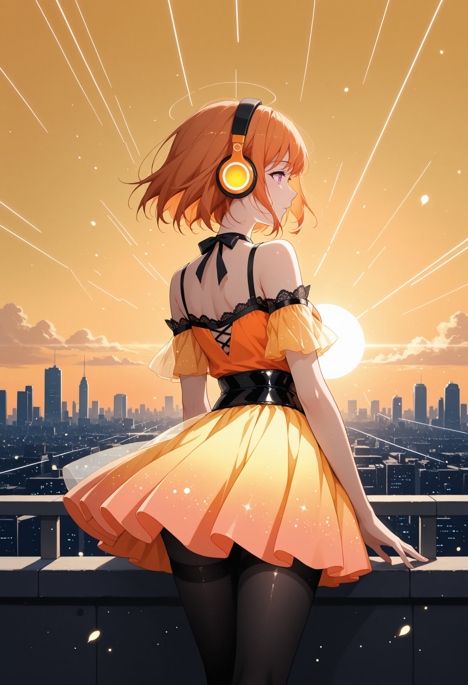 Prompt: anime style, beautiful Japanese idol girl Zena:1.3, short orange bob hair:1.4 softly illuminated by the sunset glow, wearing pastel orange headphones:1.3 that shimmer gently in the light. Her outfit is a futuristic idol dress:1.3 in orange and black tones, with open shoulders and a mini skirt, detailed with delicate lace and soft leather textures. The subtle neon lines on her outfit glow tenderly, blending harmoniously with the warm golden sky. She stands on a rooftop overlooking a futuristic city, bathed in the soft orange and pink hues of the evening sun. Her expression is gentle yet confident, eyes reflecting kindness and quiet strength. A breeze lifts her hair slightly as the sun dips below the skyline, scattering particles of light around her like drifting stars. The atmosphere captures a moment between day and night — nostalgic, beautiful, and full of hope. cinematic anime lighting, soft focus, delicate color balance, glowing reflections, ultra-detailed fabric textures, emotional composition, masterpiece.