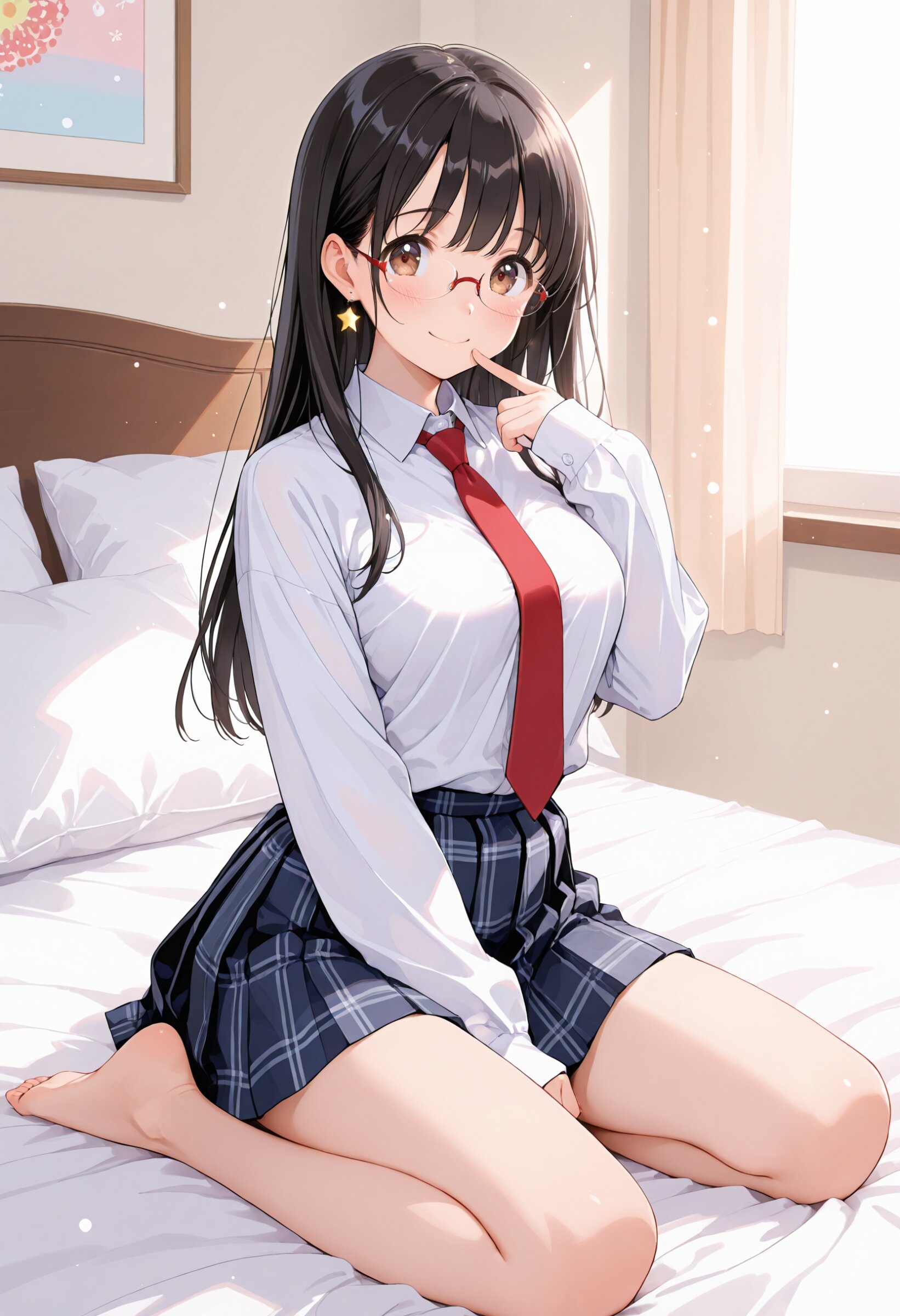 1girl, 17 years old, 155cm tall, brown eyes are shining and cute, black hair, long hair, extremely detailed neat hair,Straight hair, tareme, ((red semi-rimless eyewear:1.2)), star earrings, medium breasts, smile, blushful, happy, compassion, (collared white shirt, checked pleated skirt, red necktie), sleeves past wrists, japanese, sitting, (barefoot:1.3), playful expression, finger on mouth, bedroom, on the bed, soft lighting, indoor, Soft pastel colors, doodle style with gentle lines, horizontal layout, plenty of white space, simple background, cozy and note-like atmosphere.