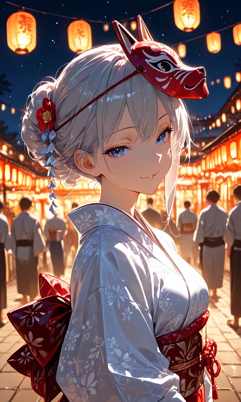 (best quality),(masterpiece),(ultra detailed),1 lady,hair bun, silver hair, blue eyes, seductive smile, Japanese cloth, Japanese festival, (festival mask)