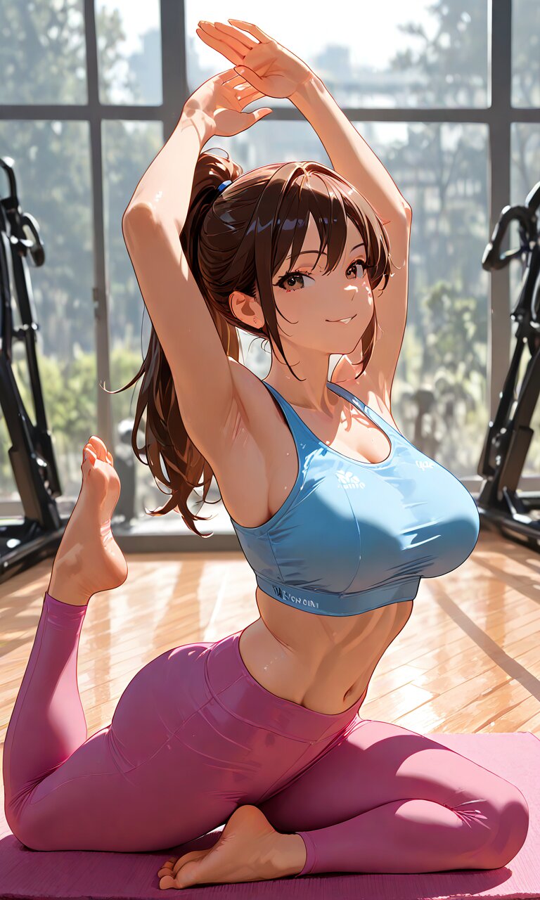 1 lady, long ponytail, brown hair,big breasts, smile, (sports bra, leggings), ((yoga pose))