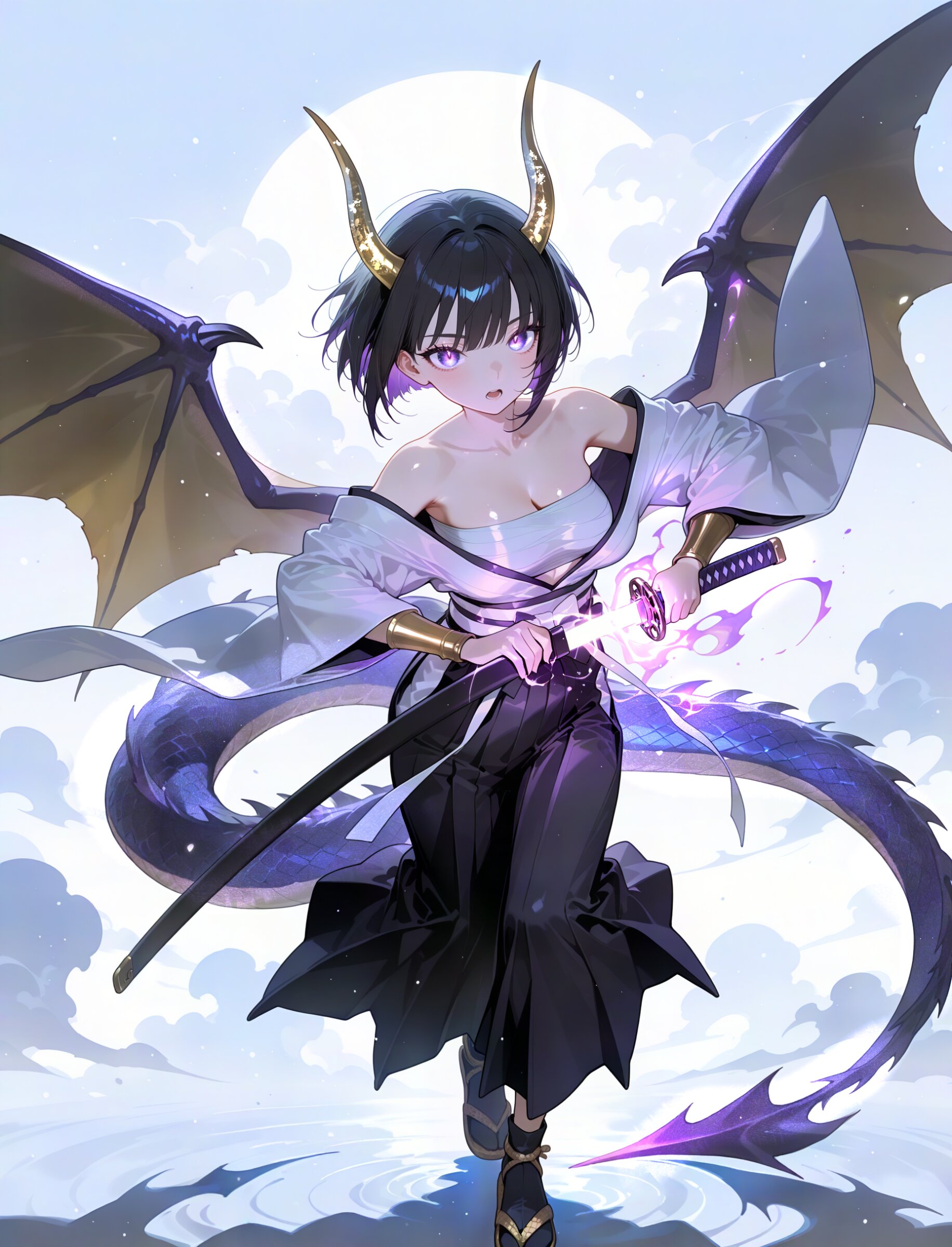 (face:1.3) (from above,looking up:1.0) paper background, sumi-e, faux traditional media, color ink \(medium\), painting \(medium\), calligraphy brush (medium), , spot color, 1dragon girl, solo, dragon girl, 16yo, (2dragon gold horns attached to the head:1.2), (dark purple black hair:1.2) (very short hair:1.0) (bob cut:1.0) (pixie cut:0.4), (violet eyes:1.2) beautiful iridescence eyes, cute, cool, (muscle,buff well-built body,ultra-detailed muscle:0.5) , first-rate female bodies, perfect body medium breasts medium hips cute, a dragon tail (2long black dragon wings on back:1.2), dark brown ankle-length hakama, (overskirt:1.0) White Japanese Clothes, sarashi inner, (White wide sleeve:1.0) purple and white stripe obi, bracer, straw sandals, tabi, mysterious face, calm, expressionless, (light smile:0.5), (mysterious eyes:1.0), (mysterious smirk:0.0), open mouth, mysterious atmosphere, glowing japanese short sword, (japanese sword action:1.0), glowing sword katana battoujutsu stance, (ready to draw,scabbard,unsheathing, holding sheath:1.0) glint, (swirling purple energy,energy magic,energy:1.2), glowing eastern dragon purple aura, assassin ninja action, ink wash painting, An illustration with line art drawn using a brush, featuring dynamic movement lines expressed with thick sumi ink strokes. super fine concept art, hard surface, graceful eyes, masterpiece, best quality, amazing quality, very aesthetic, absurdres, newest, professional art lots of details, , overexposure, shiny-glistening, (watercolor style:0.0), (pastel color style:0.0) 4ur4_illu,shiny, glowing, glowing particles, glowing light particles, light particles, amber light particles , <lora:noline (1):-0.5> <lora:sdxl2-flat2-512b:0.2> <lora:facelightup_xl_v10:0.5> <lora:V2_yakumo_alchemy:0.2> <lora:Aura_illu:0.1>