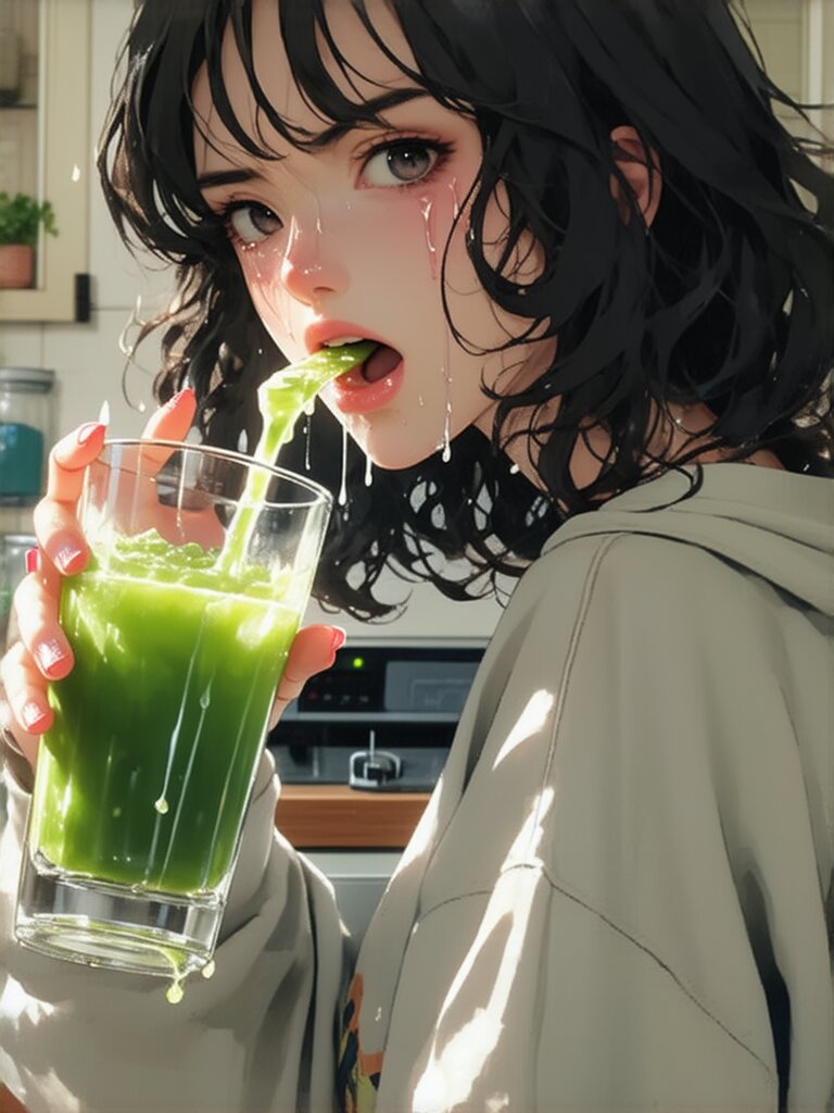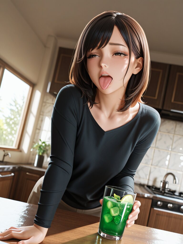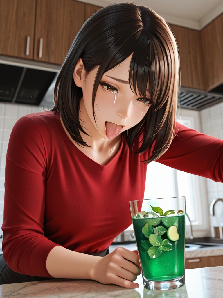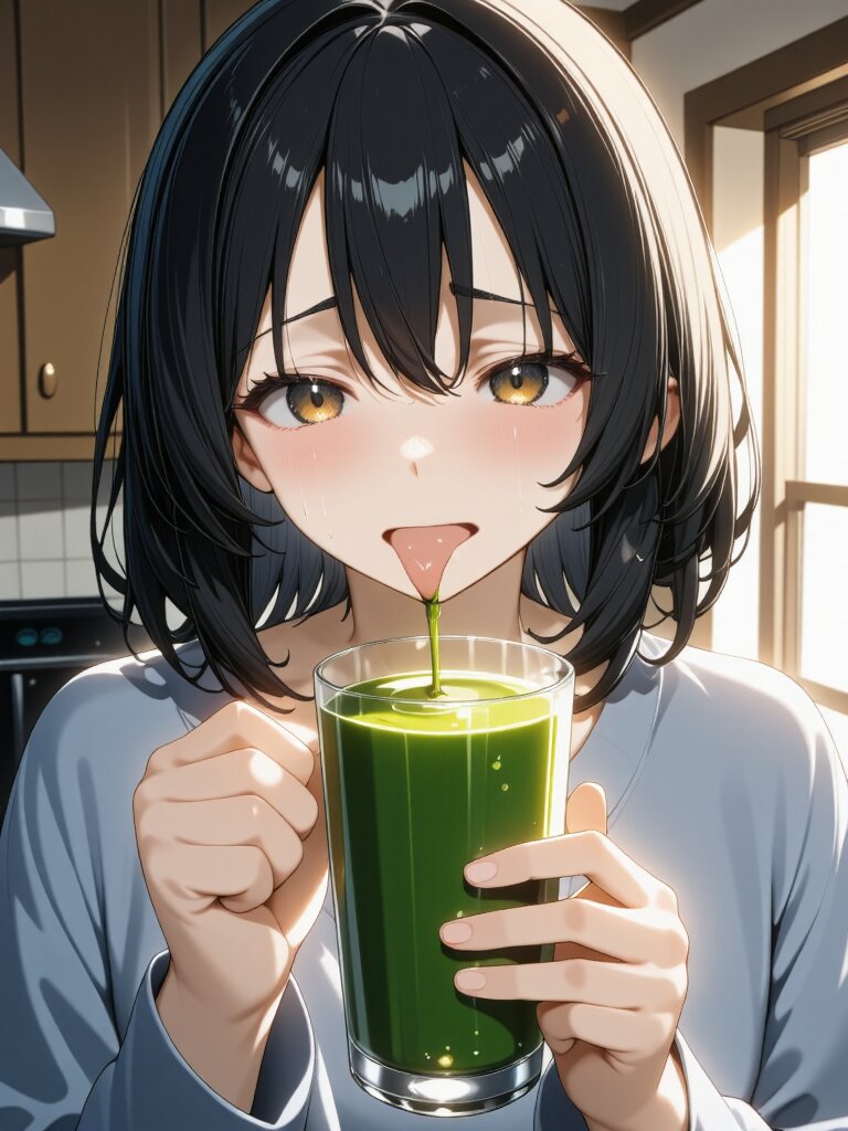 Masterpiece, Best Quality, Amazing Quality, Very Aesthetic, 4K, Very Aesthetic, High Resolution, Ultra-Detailed, Absurdres, Newest, General, 1Girl, Flat_Chest, Mature_Female, Aged Up, Brown Eyes, Swept_Bangs, Habitual_Hair, Medium_Hair, Black_Hair, Long_Sleeve_Shirts, Nauseated, Tongue_Out, Tearful, Bust_Up, Standing, Green_Juice, Glass, Holding_Glass, Looking_at_Glass, Dynamic_Pose, Dynamic_Angle, Indoors, Kitchen, Day, Dramatic_Lighting, BREAK, Depth of Field, Volumetric Lighting,