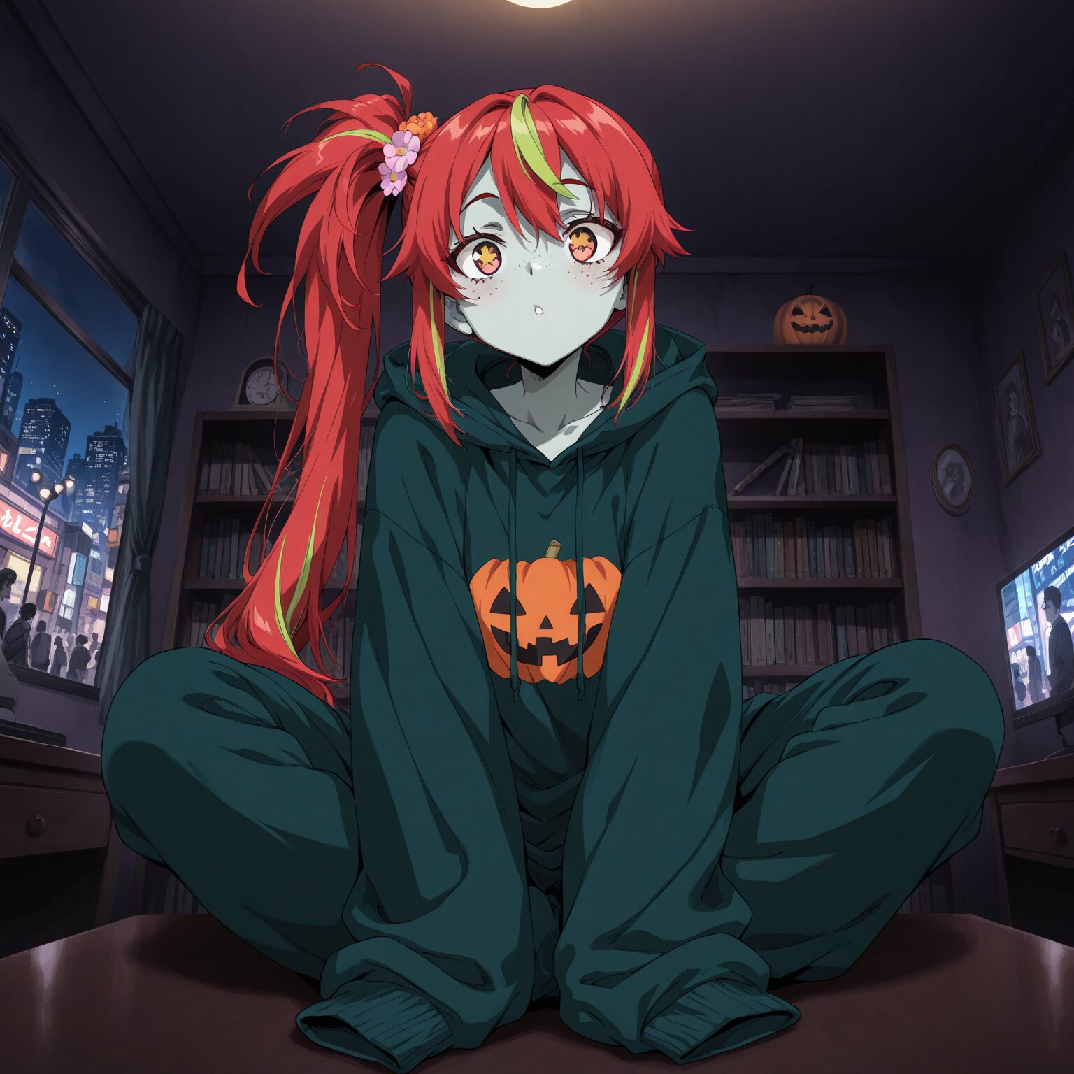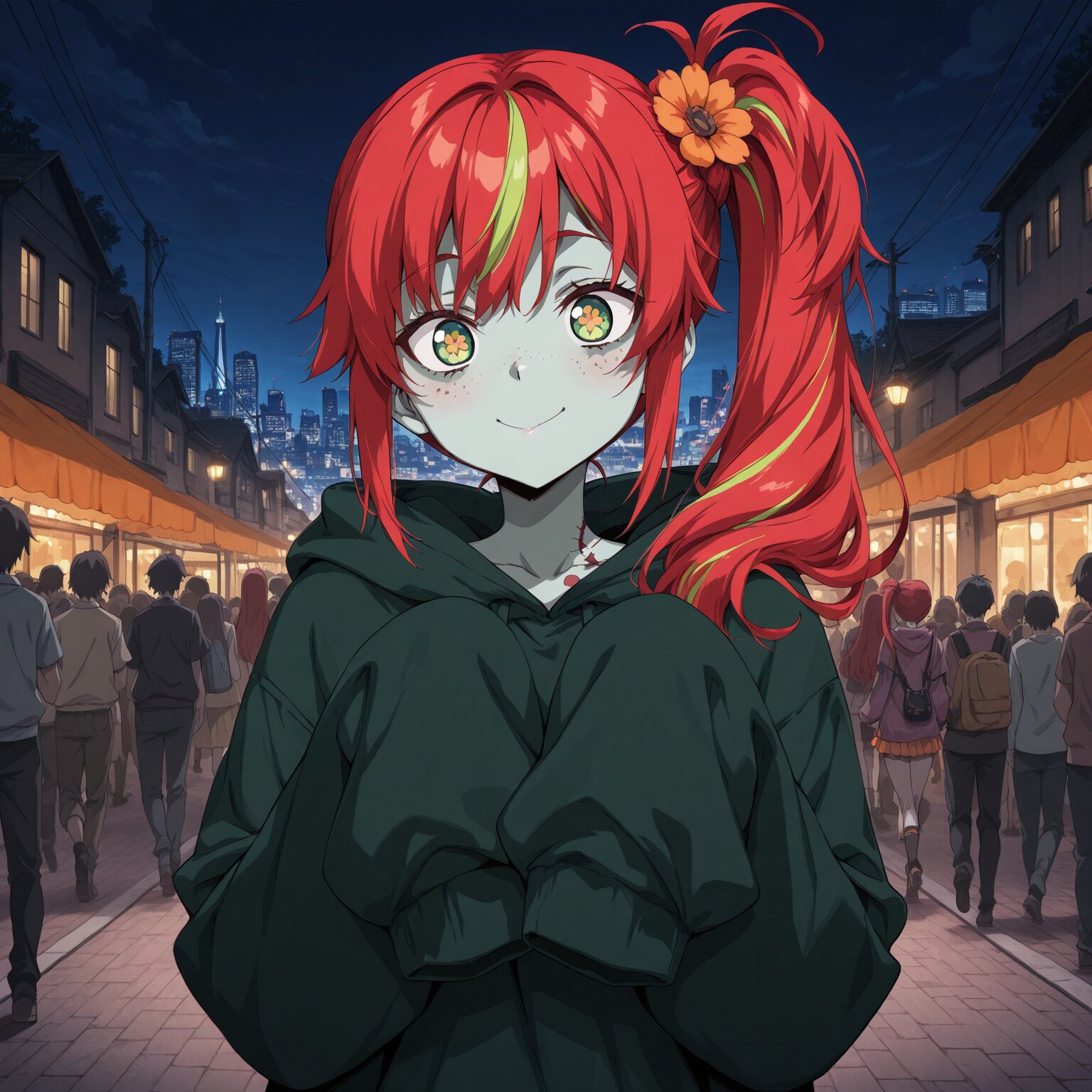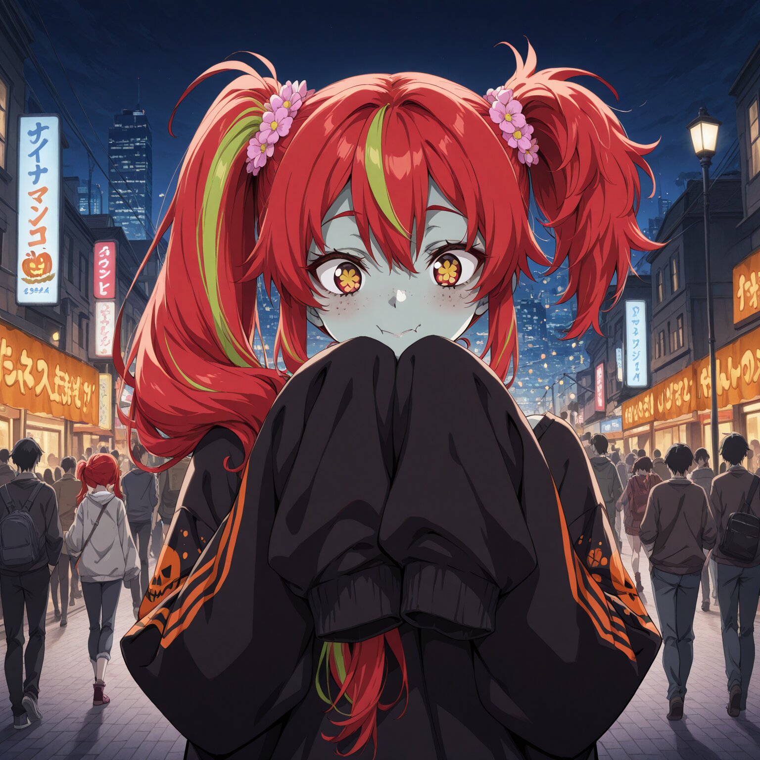 (1girl), Long hair, red hair, Yellow-green streaked hair, ((uneven twintails))Unbalanced pigtails , freckles, (flower-shaped pupils) sleeves sleeves past fingers Zombie, zombie costume Halloween, Halloween cityscape, crowd, bustling city, night, street lights BREAK, ((newest, year 2024, anime, animation, anime screen capture, anime style:1.3)) BREAK, ((masterpiece, , vibrant, very aesthetic, highly detailed, best quality, 16k:1.3)) Perfect hands, perfect fingers,