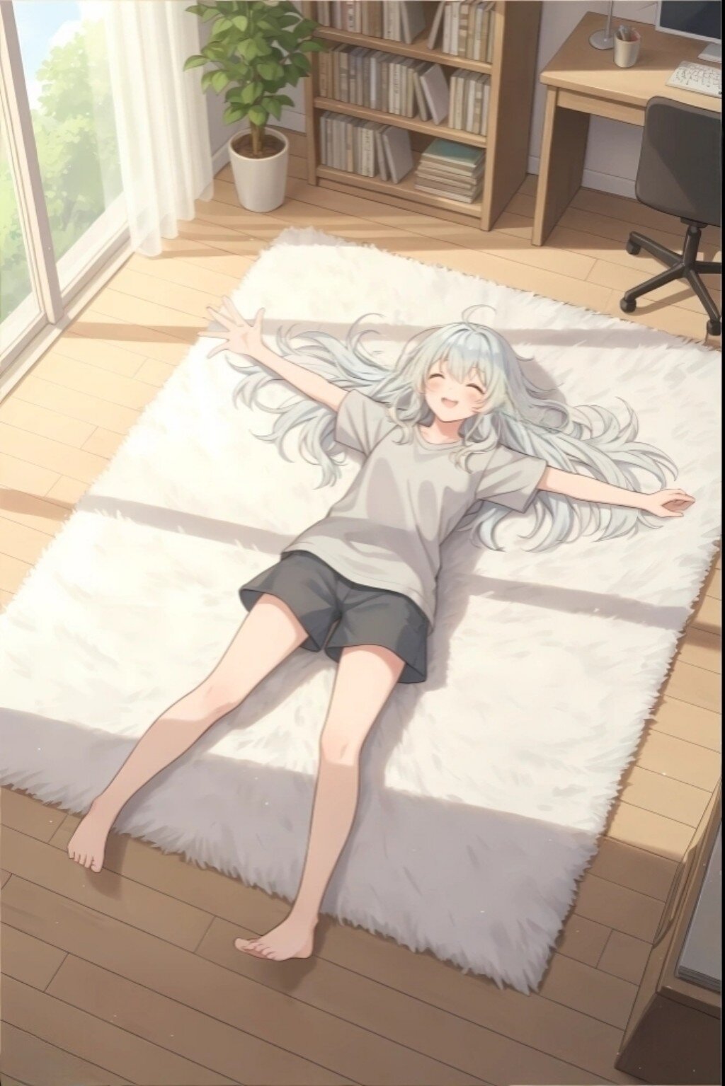 (best quality, masterpiece), (anime style, official art, finely detailed beautiful eyes), 1 cute girl, solo, long white hair, happy expression, closed eyes, open mouth, small smile, lying on a fluffy white rug, arms outstretched, grey t-shirt, dark grey shorts, bare feet, sunlight, sunny room, large window, outside visible through window, wooden floor, bookshelf, many books, wooden desk, office chair, potted plant